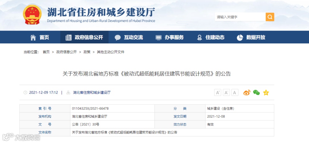 现批准《被动式超低能耗居住建筑节能设计规范》为湖北省地方标准,编号DB42/T1757-2021,自 2021年12月30日实施。
