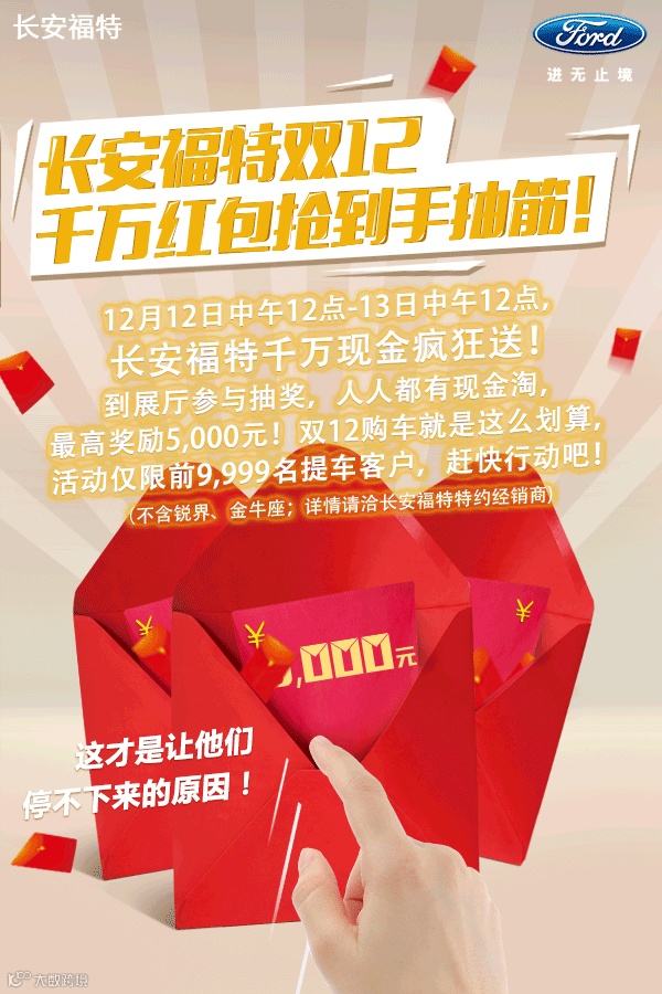 12月12日中午12点-13日中午12点,长安福特千万现金疯狂送!到展厅参与抽奖,人人都有现金淘,最高奖励5,000元!双12购车就是这么划算,活动仅限前9,999名提车客户,赶快行动吧!