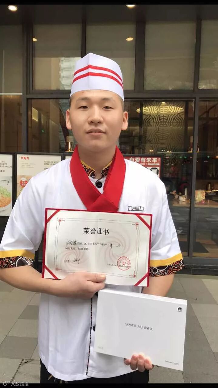 平时到门店观察、认为陈晓腾是一个很有礼貌、做事很踏实、爱笑的员工,希望他接下来把这种学习氛围带给更多的人,自己也在九毛九有更好的发展。
