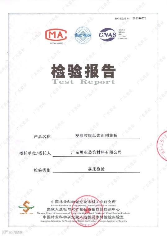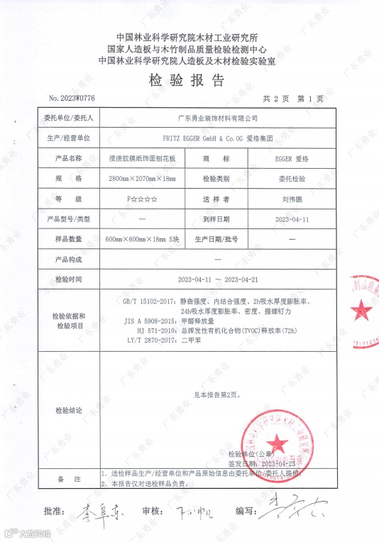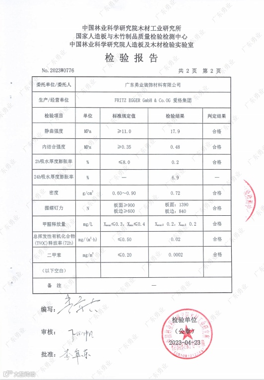 △爱格双饰面板 此次广东勇业送检的爱格双饰面板, 获得CMA中国计量认证、 ILAC-MRAL 国际实验室认可使用组织认可、 CNAS中国实验国家认可(国际互认), 甲醛释放量为0.2mg/L, 符合F☆☆☆☆ 日本JIS A 1460标准。