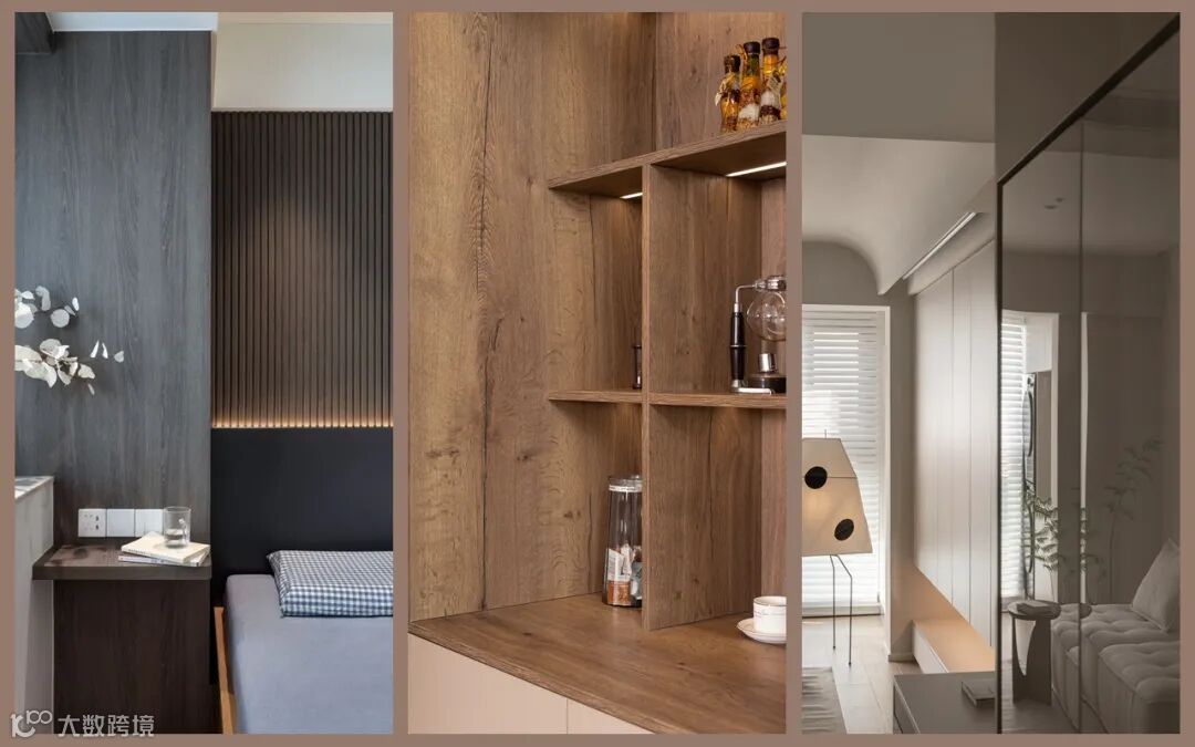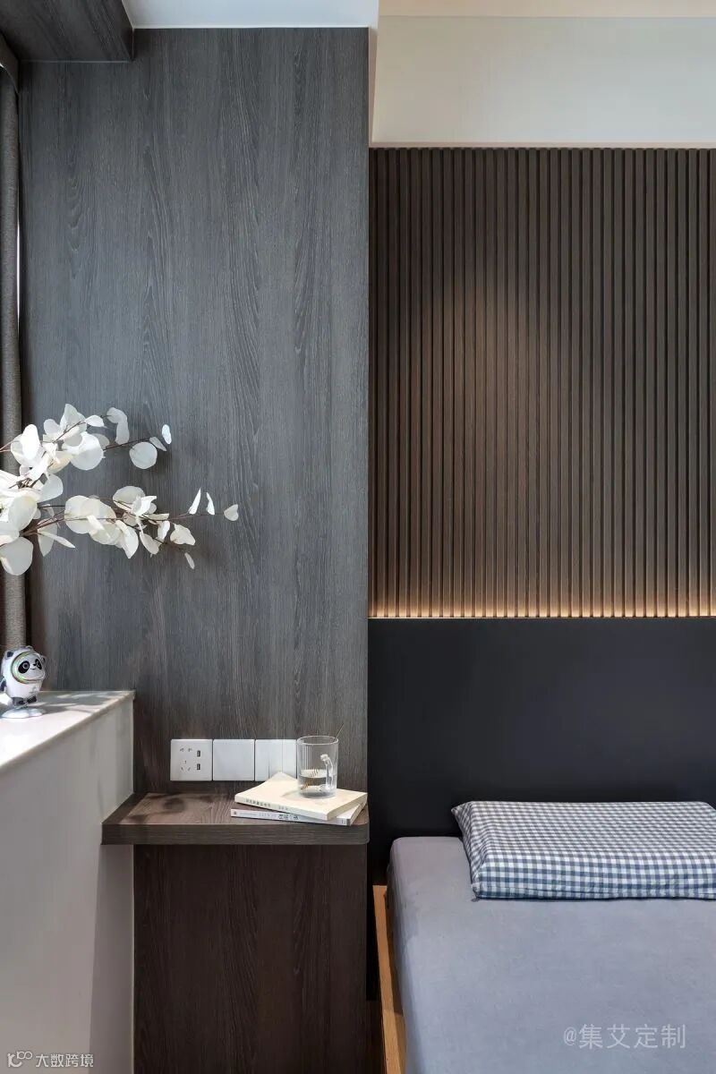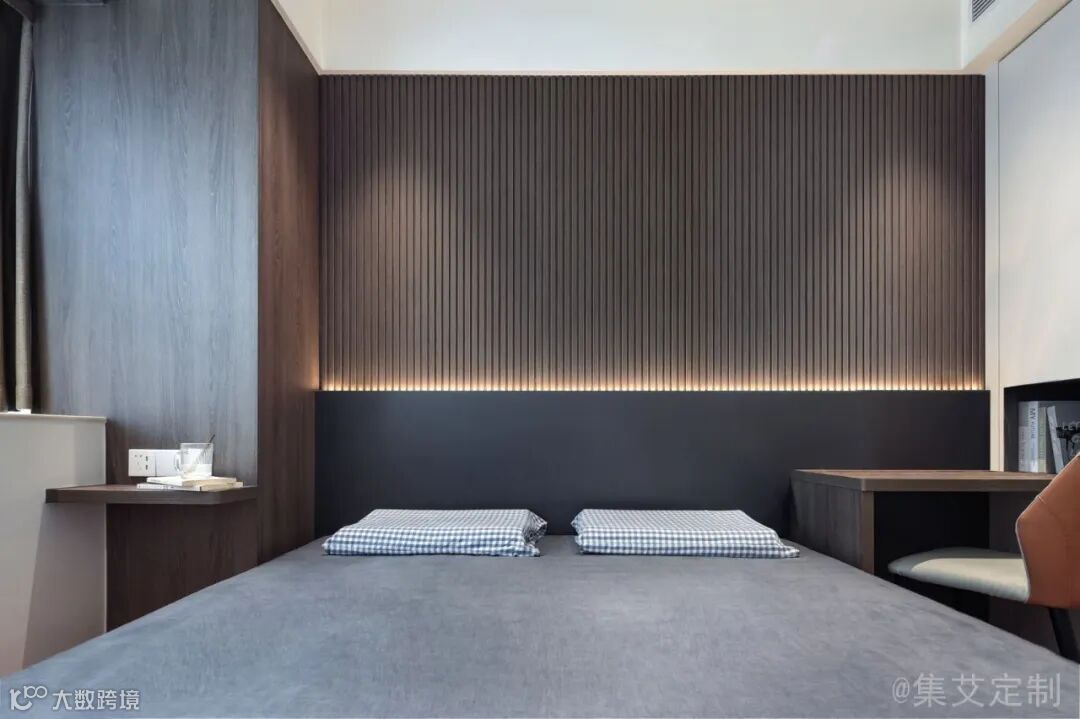 卧室背景使用爱格U960 ST9玛瑙灰与木格栅的搭配,加上灯光的渲染,视觉层次丰富,自然优雅且格调满满。
