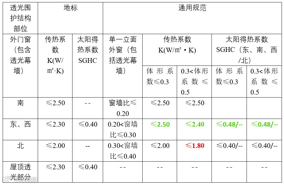 4)外门窗按朝向判定传热系数改为按照单一立面不同窗墙比范围进行判定。