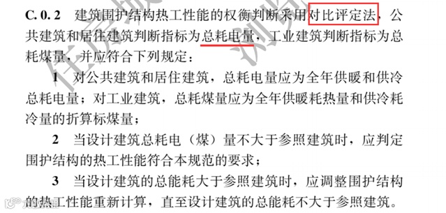 通用规范要求能耗计算应采用对比评定法,即权衡的能耗计算采用动态的计算方式,最后将设计建筑的能耗与参照建筑的能耗进行对比评定,参照建筑的能耗随设计建筑的参数的变动而有所变化,并不是一个固定的数据,最终设计建筑的总耗电量小于参照建筑的,即可判定该建筑权衡计算通过。