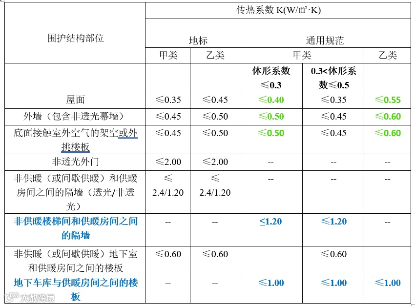 1)甲类传热系数限值根据不同的体形系数范围而限值不同;对于体形系数小于0.3的建筑,传热系数限值放宽,具体限值数据见下图;