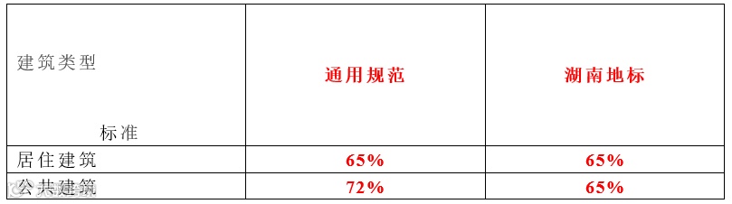 通用规范在现行公建国标的基础上,节能率再次提高20%,到达72%;现行湖南居住建筑节能率与通用规范中要求的夏热冬冷地区平均节能率持平,但围护结构热工性能要求有所提高。