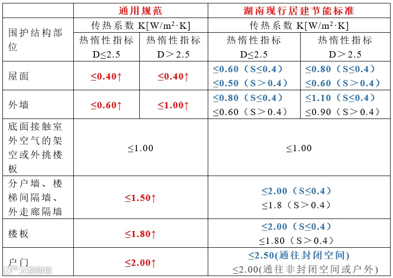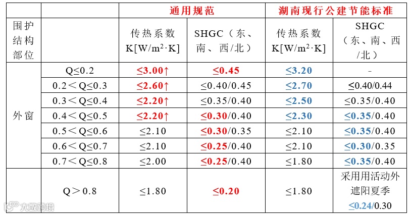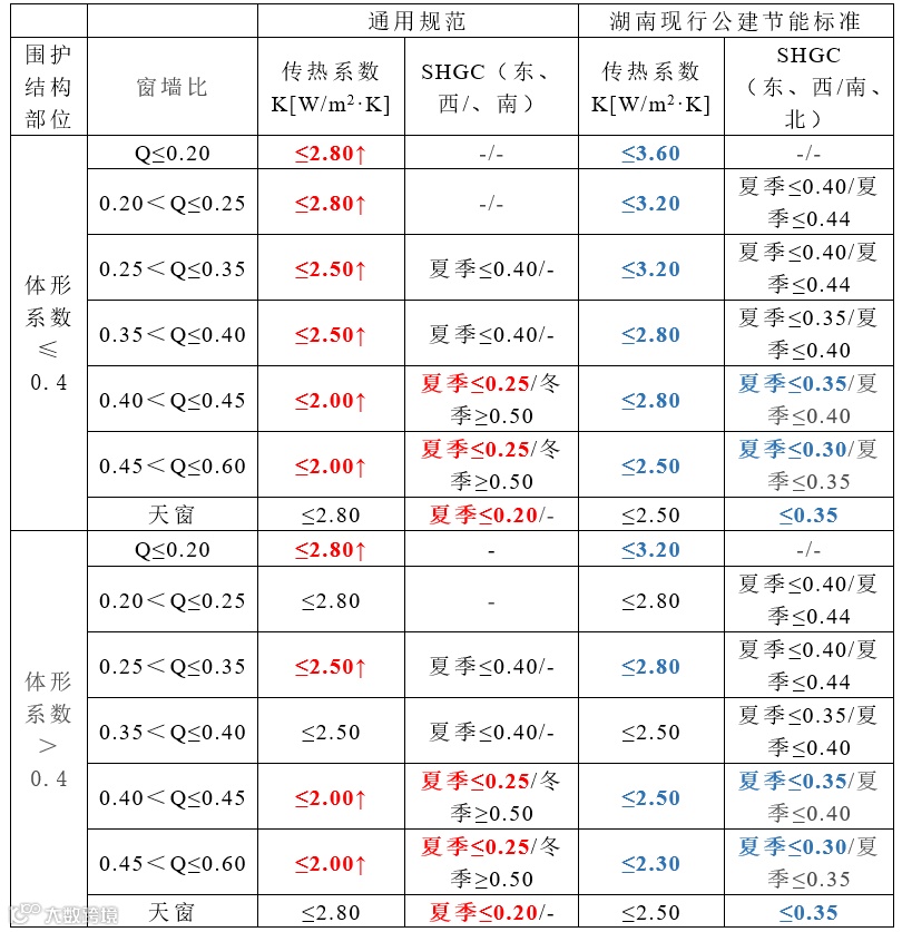 1)通用规范对夏热冬冷地区窗墙比作了强制要求,此前湖南居建节能标准无窗墙比要求,当窗墙比超过0.45时,要求外窗性能采用更优(体形系数≤0.4,K≤2.5;体形系数>0.4,K≤2.3)的即可。