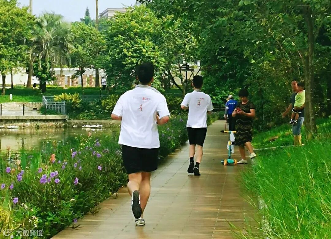 在广东佛山南海美丽的碧波湖畔激情奔跑
