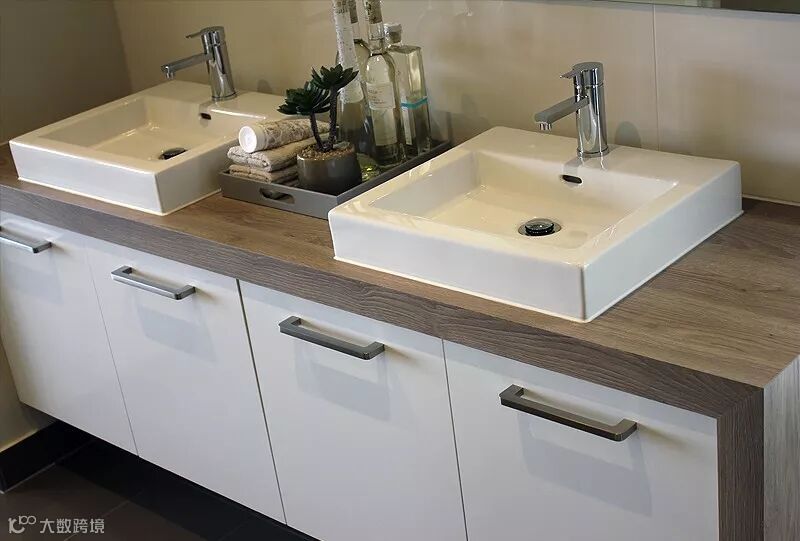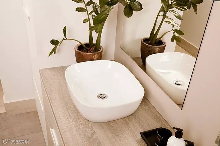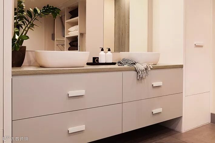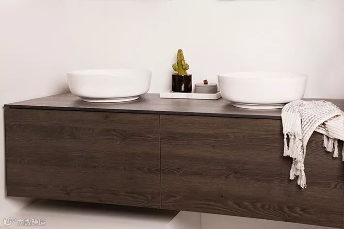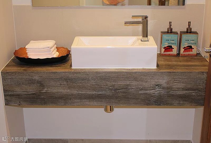 台面使用了爱格花色H1145 ST10天然巴多利诺橡木,纹理自然,且有天然的抓痕,更有大自然的味道,清雅的木纹台面,搭配白色的洁具,更觉干净利落。