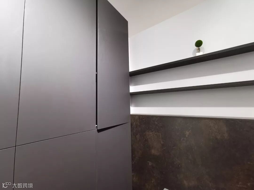 高柜选择了冷调的U963 ST9 钻石灰花色,一旁的隔板与窄柜选择了F311 ST87 碳黑陶瓷色,单色与材质花色的搭配,赋予了视觉上的变化,不会觉得单调。