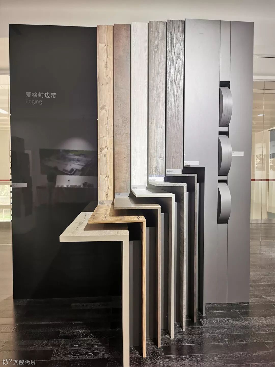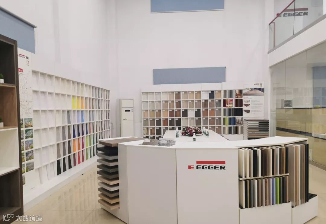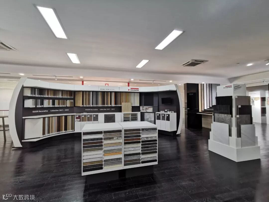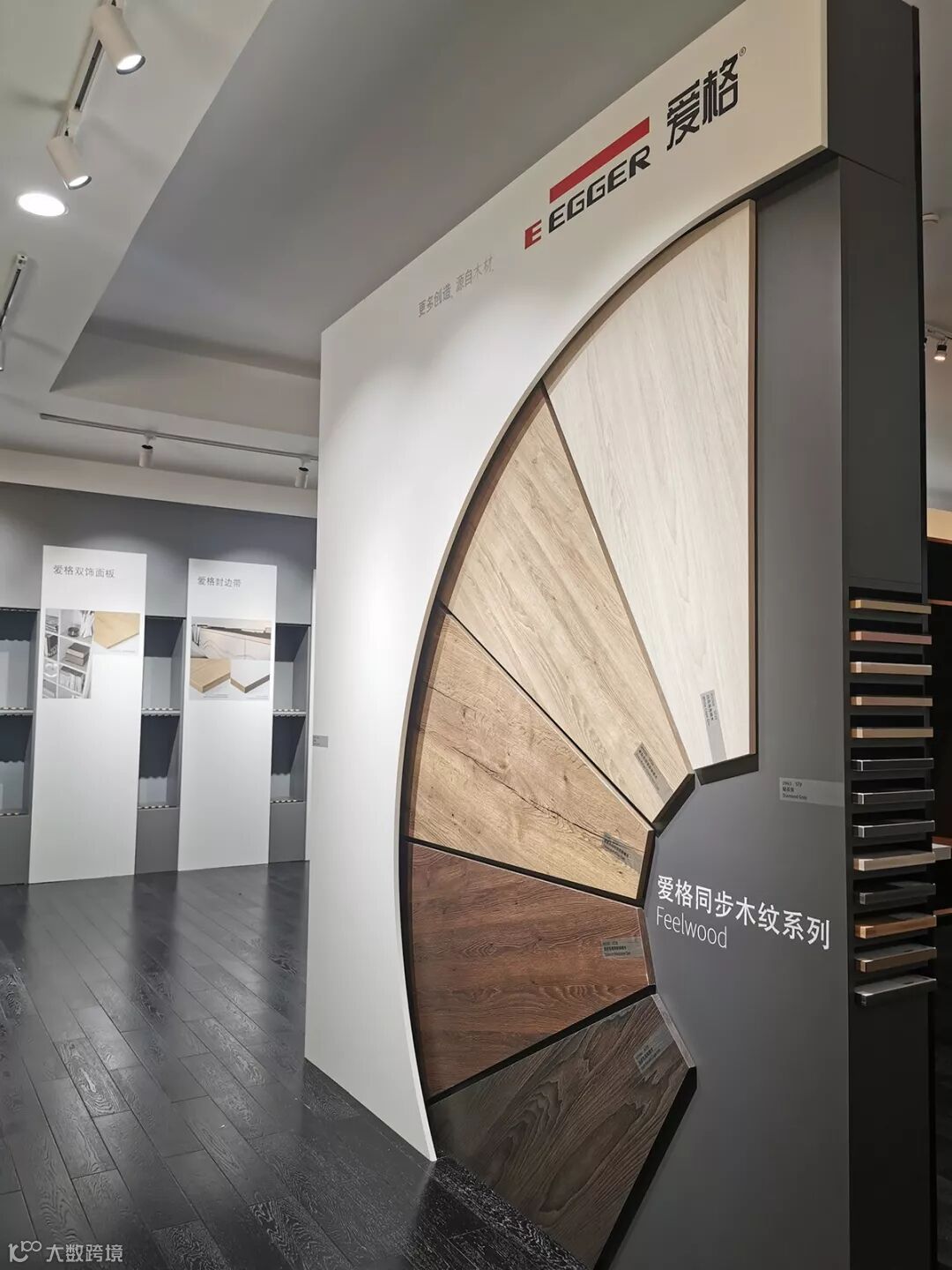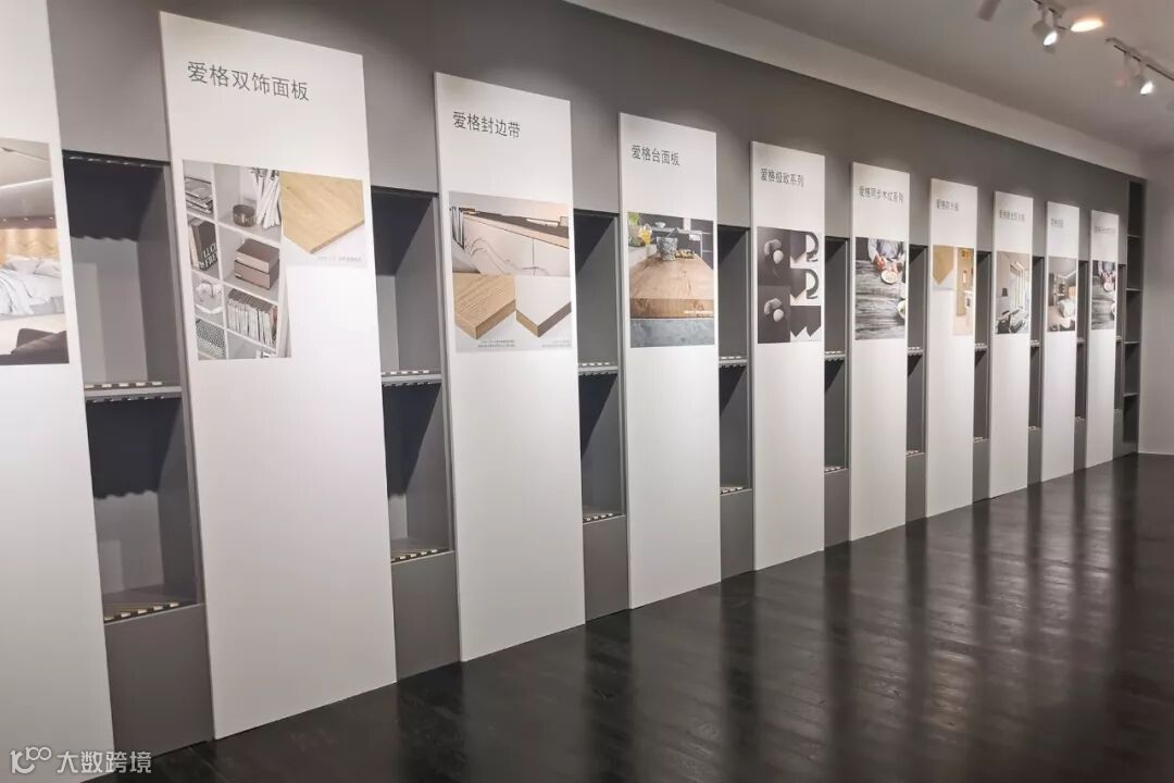 爱格公司设计的弧形展柜,通过新颖独特且美观实用的展示形式,全面展示了爱格饰面板、台面板、防火板及封边带全系列产品,也完美体现了爱格最新的花色潮流。