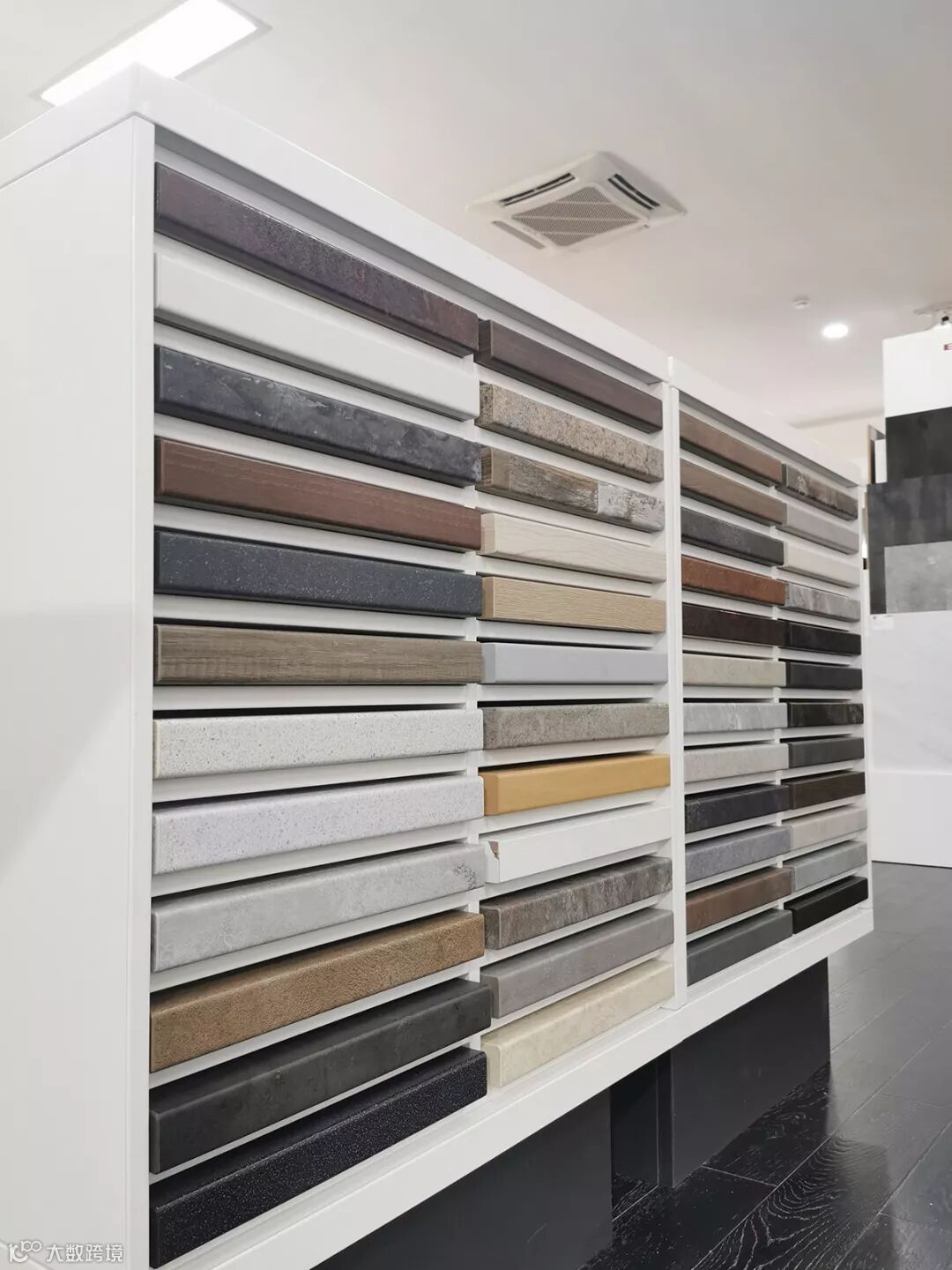 九宫格的花色墙集合了爱格近三百种花色,每个九宫格的花色,或是不同风格的搭配,或是同一系列花色的展示,丰富多彩而有规律。左侧的展示墙是设计师根据潮流花色提供搭配建议。