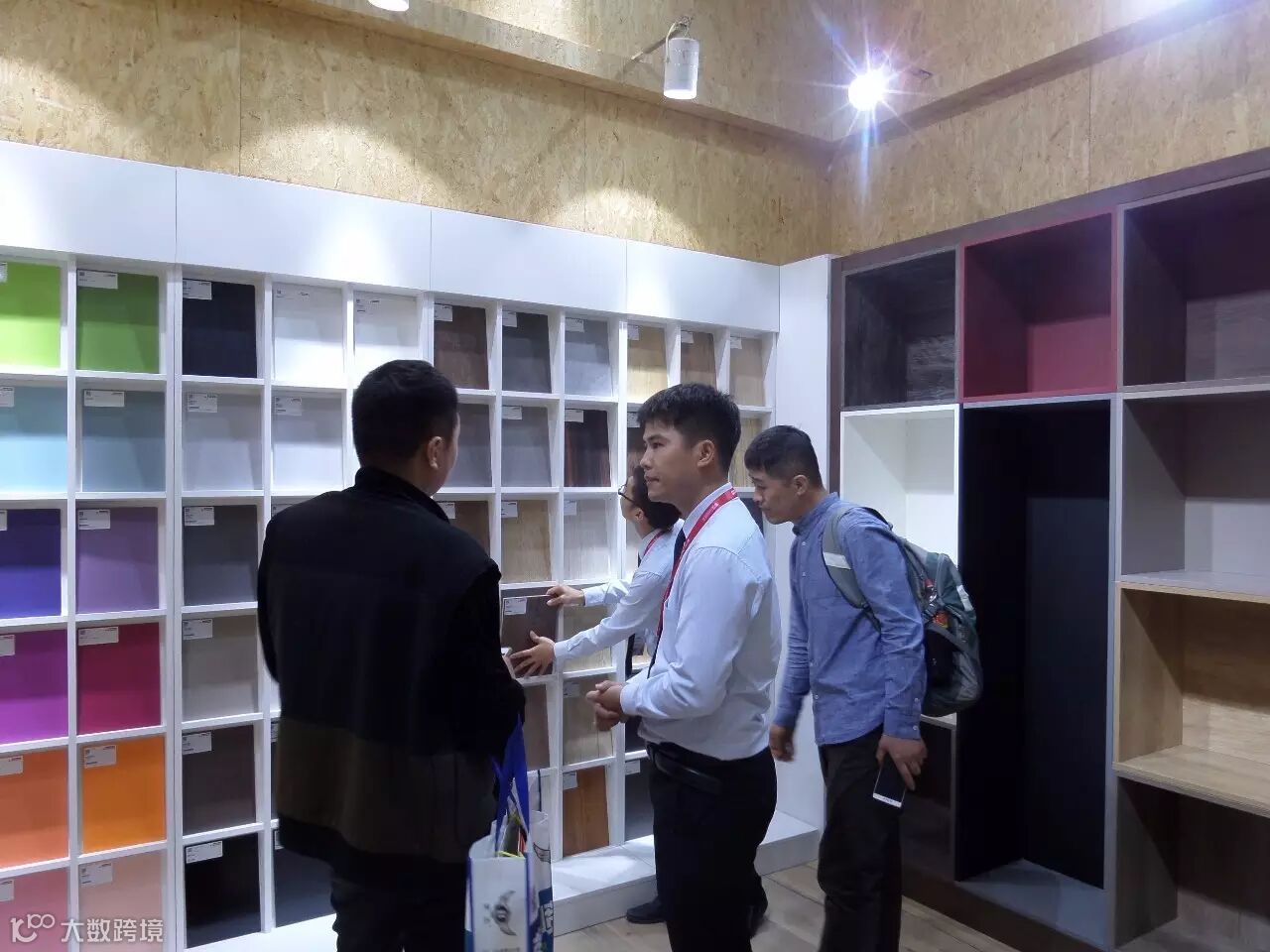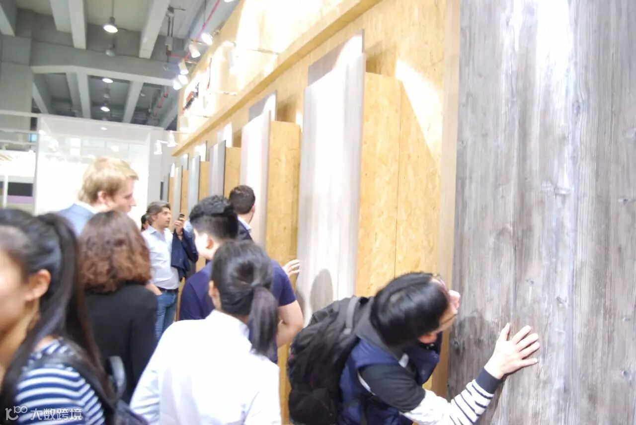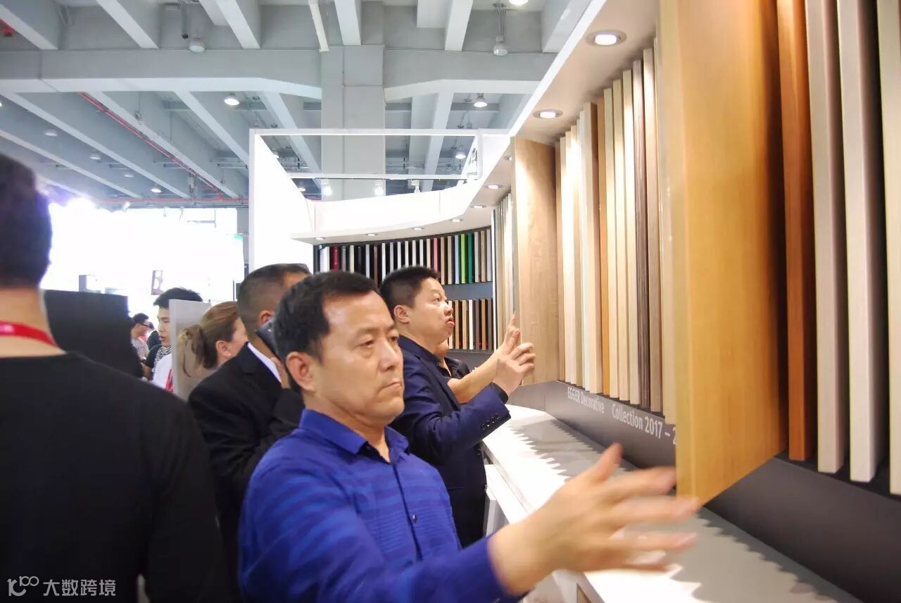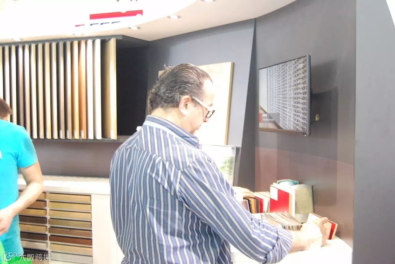 国外参观商正在查看爱格防火板花色。