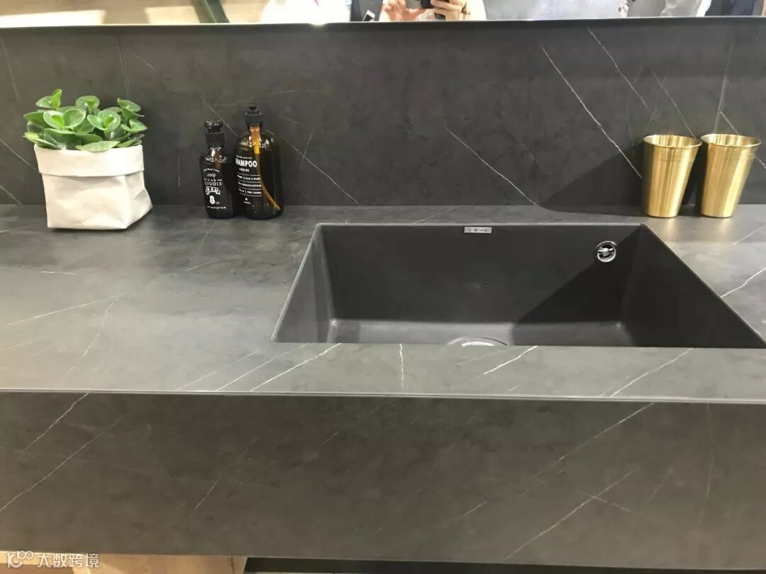 洗面台及背景选择的是爱格F160 ST9黑色马尔马拉大理石花色,营造出现代而独特的外观。这款花色有大理石的坚硬、厚重感,让人从外观上感觉到结构的稳定性。