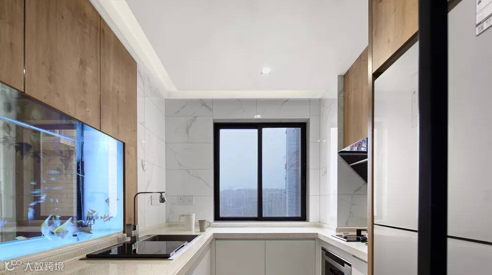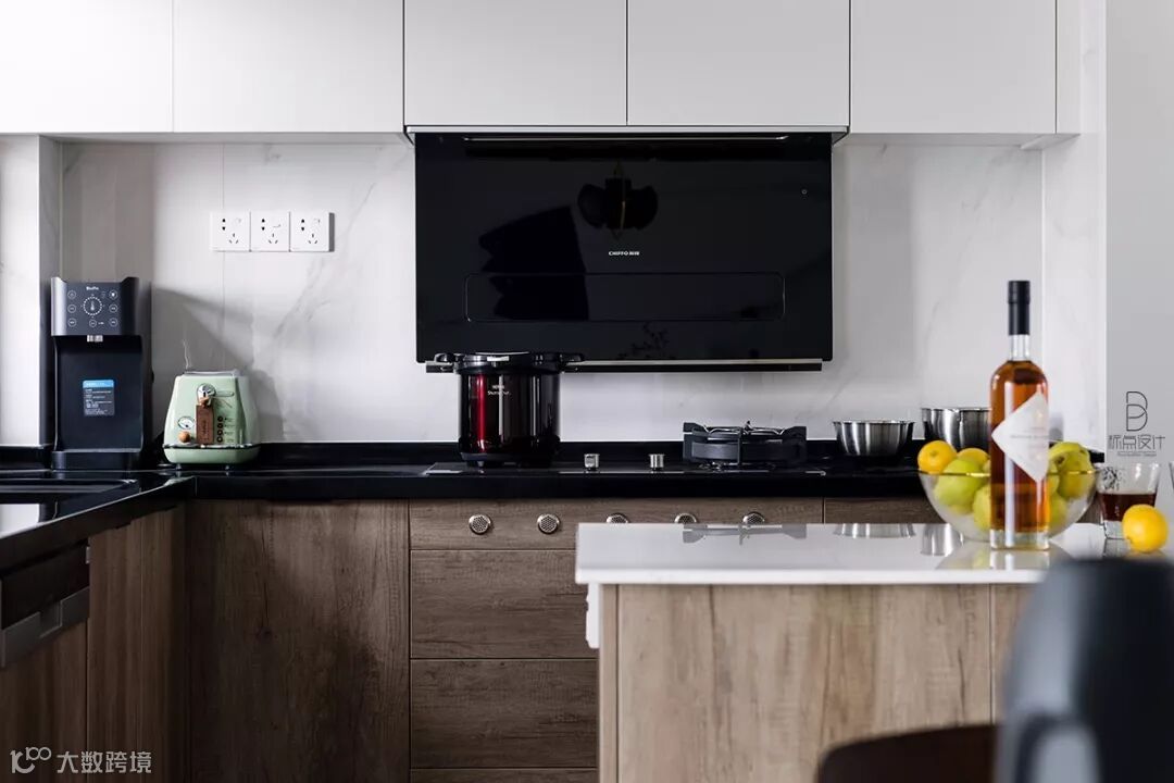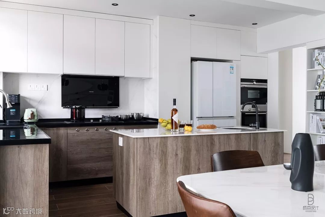 厨房的橱柜也是白色搭配自然汉密尔顿橡木花色,保持了整体风格格调的一致性。
