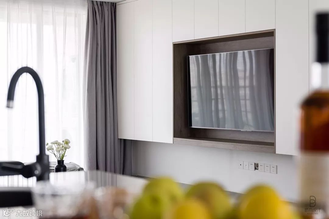 电视柜使用白色无拉手柜门,中间电视位则使用灰色内布拉斯加橡木花色,简洁优雅而有层次感。