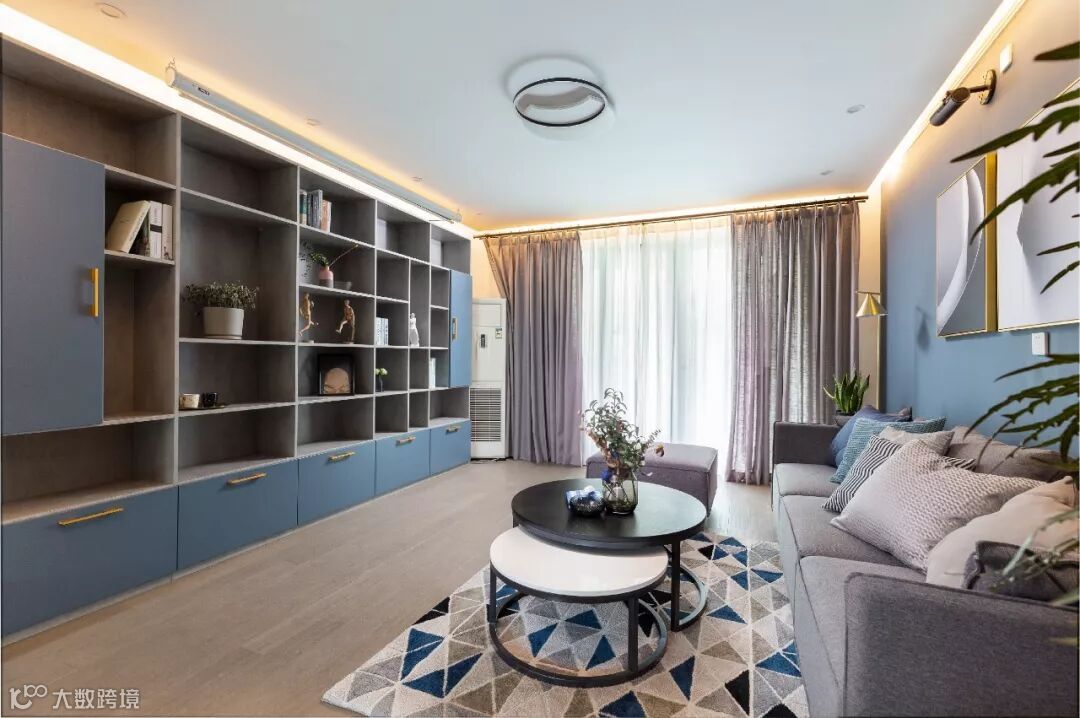 这是一套面积为129平米的精装房改造案例,空间以雾蓝色+灰色系为主色调,营造的是清新优雅空间氛围。客厅整面电视墙是用爱格板打造的书柜,感觉格外的静谧安静。
