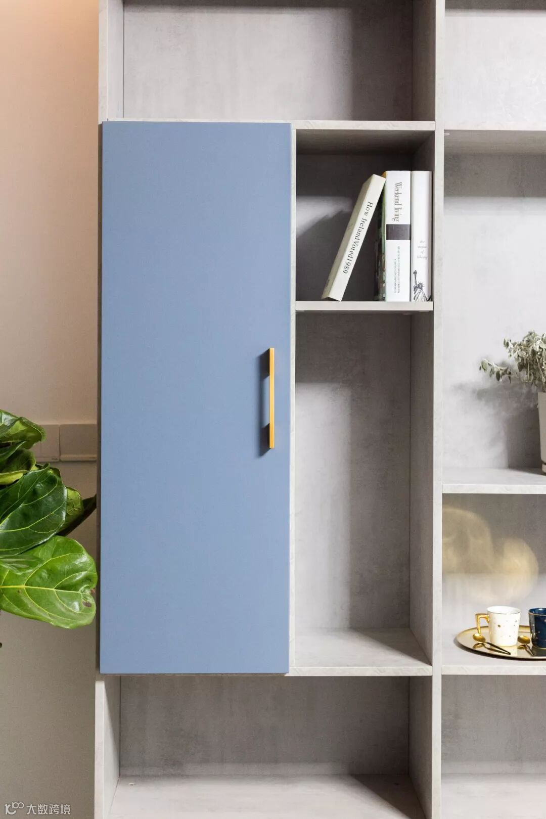F186 ST9 浅灰芝加哥水泥花色柜体搭配爱格U522 ST9地平线蓝的柜门,自然优雅舒缓的感觉让人百看不腻。
