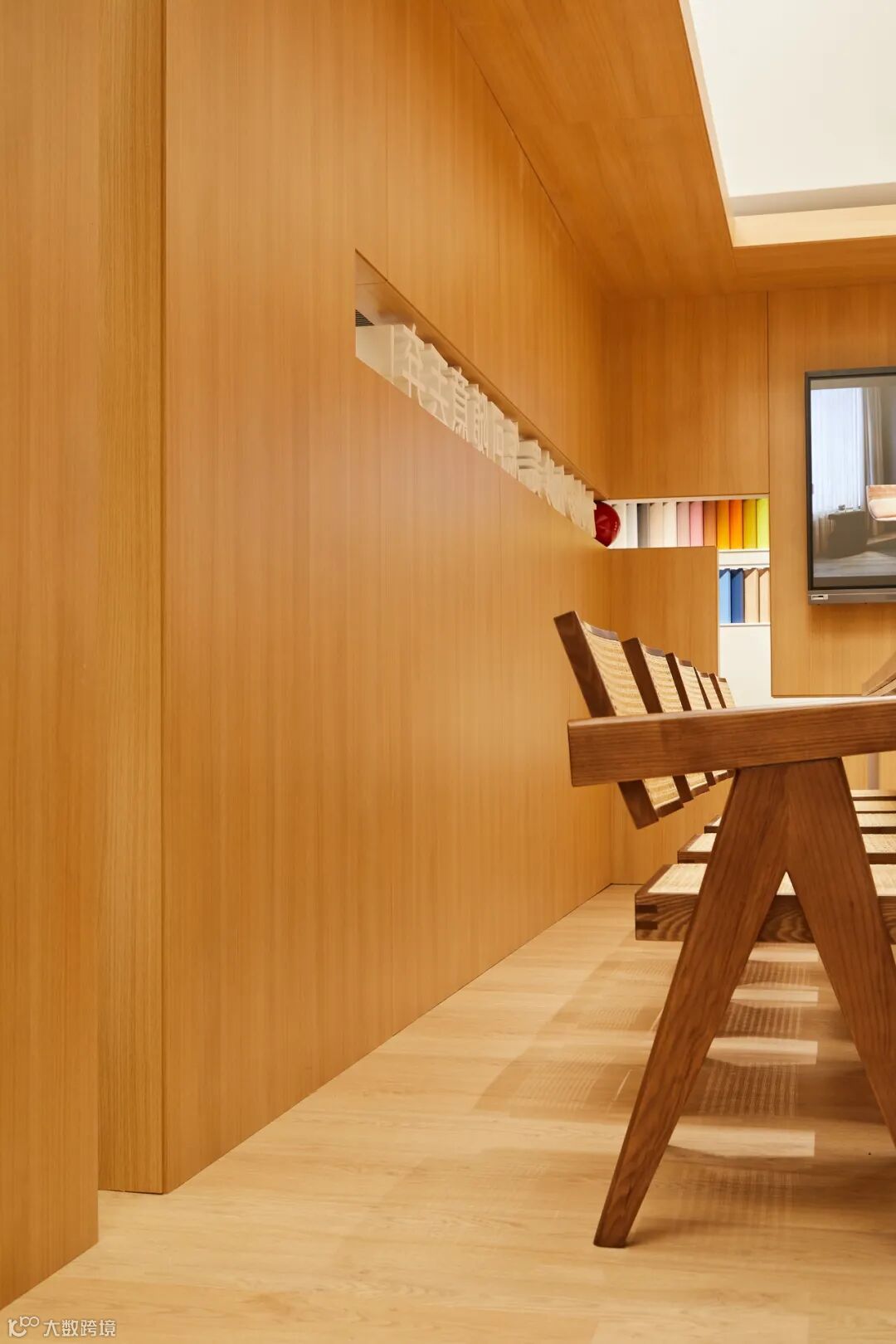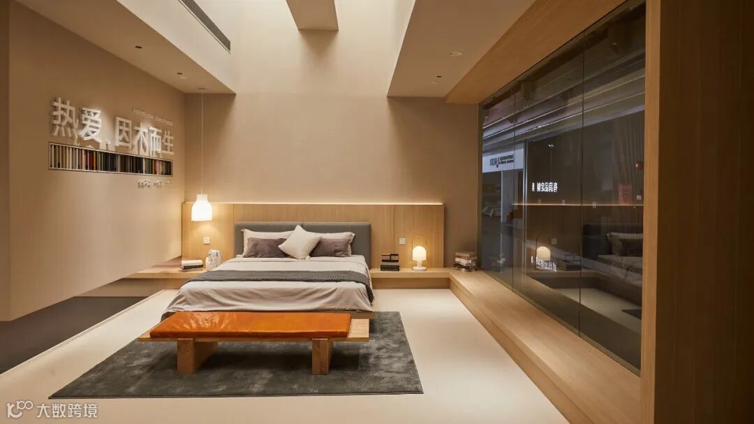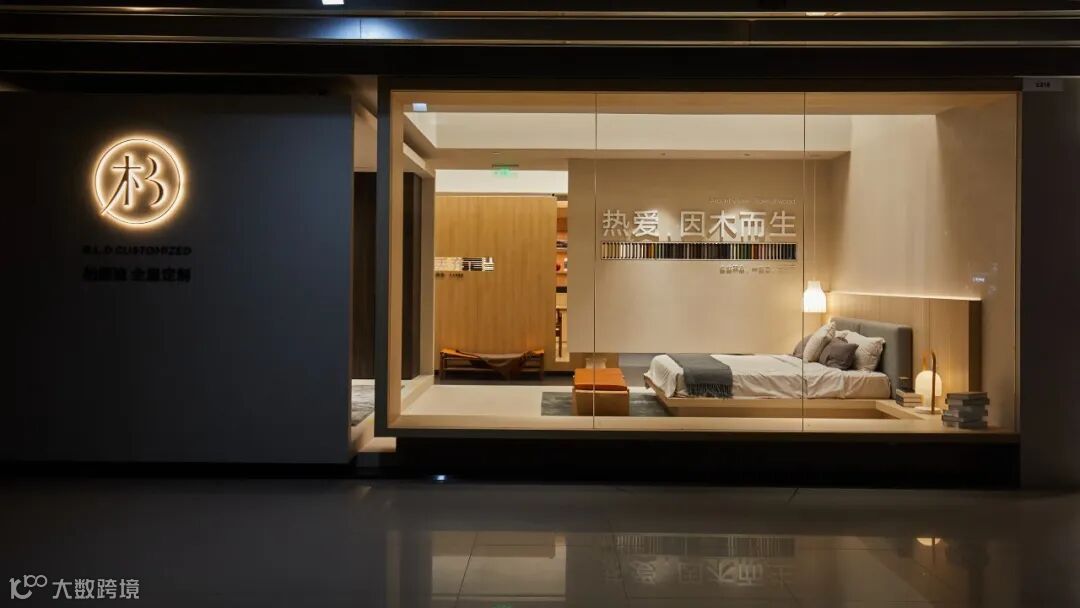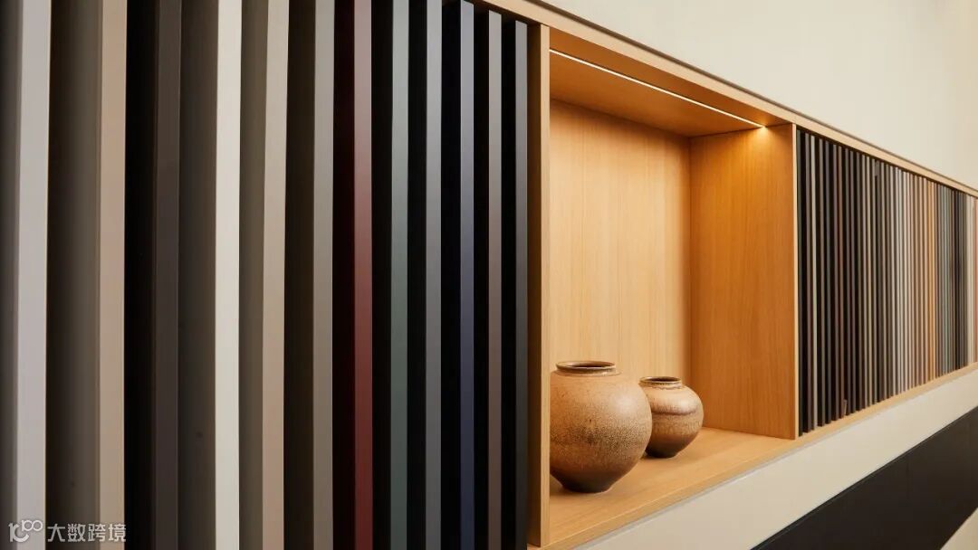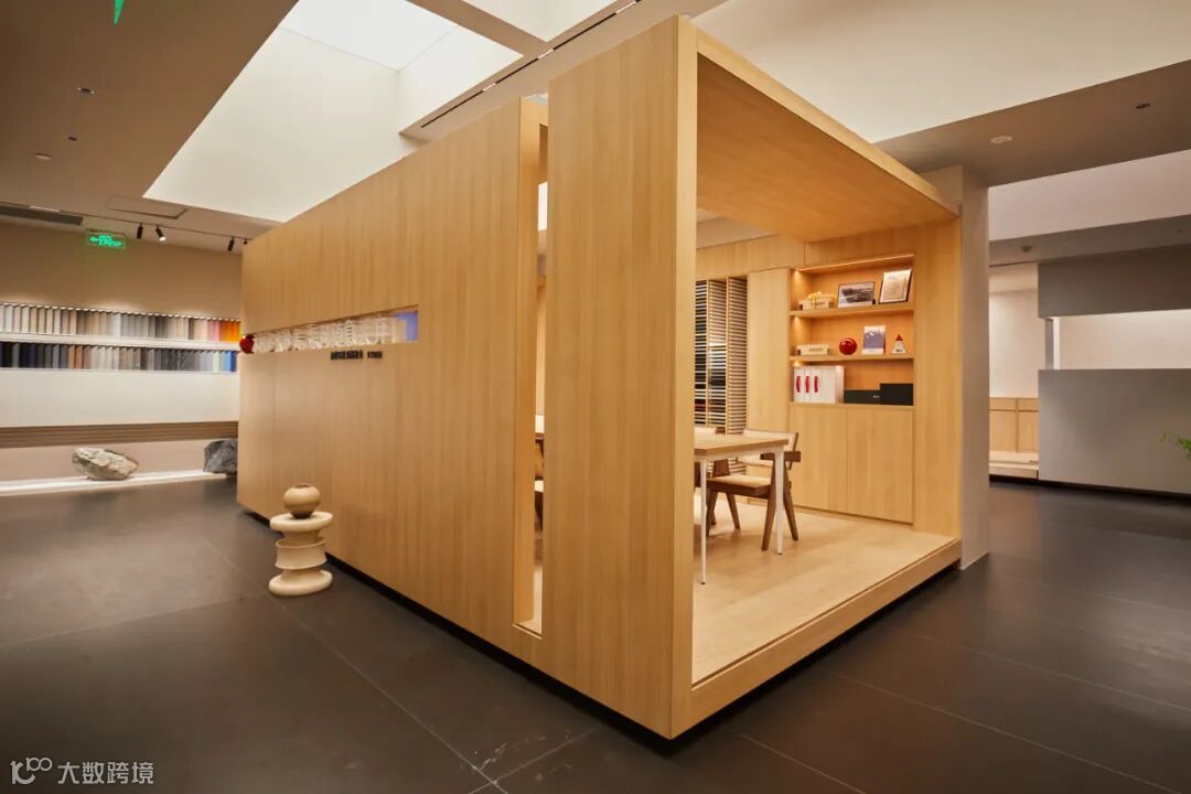 “热爱,因木而生”爱格公司的理念简约而意义深厚,应用于展厅内同样引人注目。同时,简洁地表达了提供木质产品的全屋定制。
