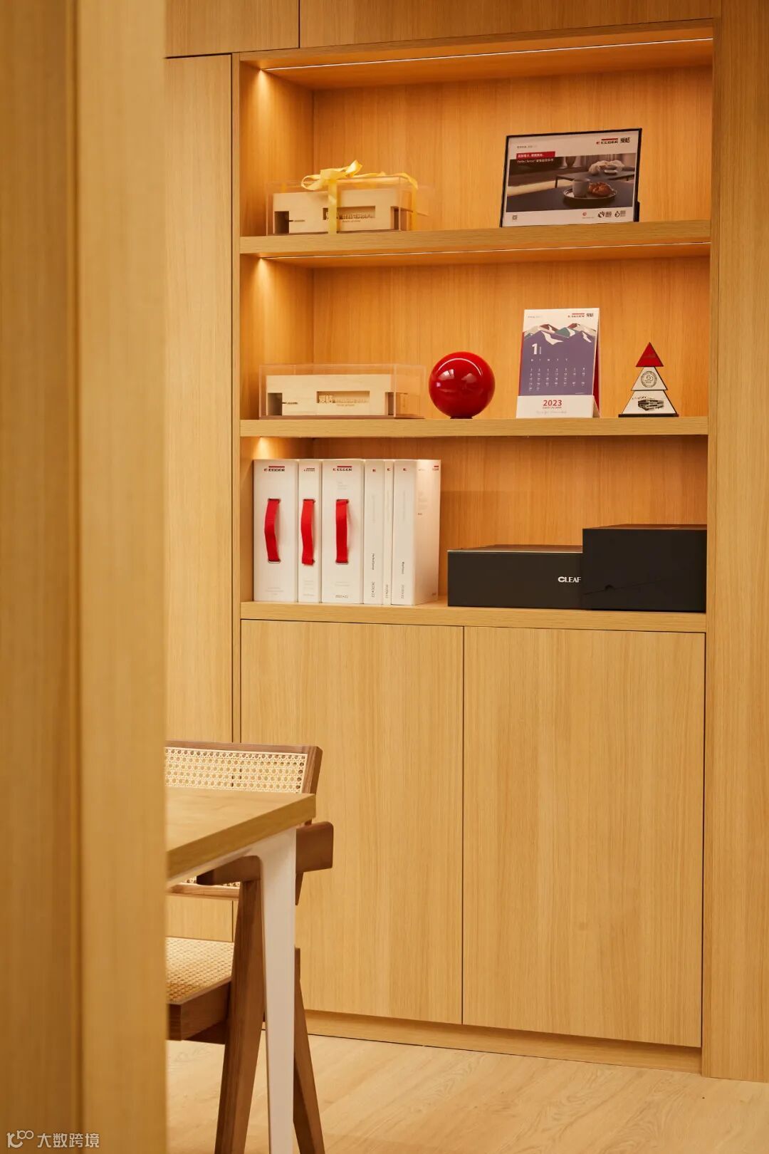 这间充满自然质朴气息的茶室,展示柜、背景全部选择了爱格H1334 ST9浅色索拉诺橡木花色,优雅的线条感与自然特质,与茶室的气质相吻合。