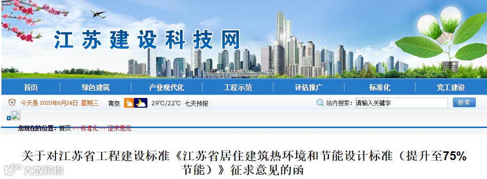 江苏省工程建设标准《江苏省居住建筑热环境和节能设计标准(提升至75%节能)》修订征求意见稿已完成。现网上公开征求意见,请提出修改意见或建议,并填写标准征求意见表,于2020年7月18日前反馈至江苏省工程建设标准站。