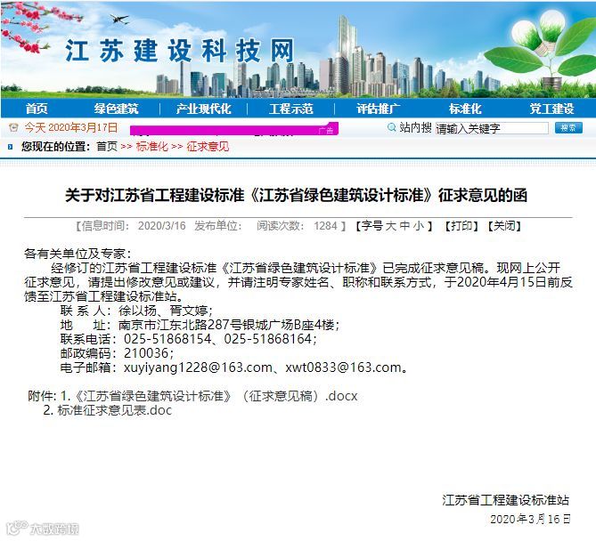 经修订的江苏省工程建设标准《江苏省绿色建筑设计标准》已完成征求意见稿。现网上公开征求意见,请提出修改意见或建议,并请注明专家姓名、职称和联系方式,于2020年4月15日前反馈至江苏省工程建设标准站。
