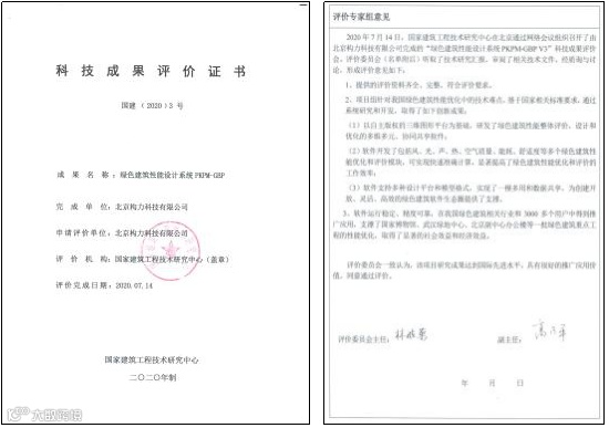 PKPM绿色建筑系列软件产品顺利通过建设部科技发展促进中心、国家建筑工程质量监督检验中心、清华大学、全国优秀节能环保产品技术评审、国家建筑工程技术研究中心的五重认证,2020年7月份通过鉴定评价,整体达到国际先进水平。
