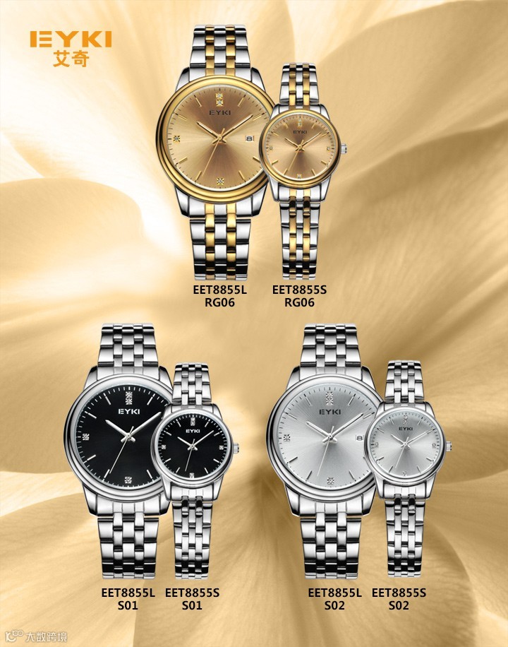 缤纷E时代,因你更美丽。浪漫情人节,我们在一起。EYKI艾奇E时代系列腕表采用简约设计,将经典元素与时尚潮流融合,尽显优雅个性,打造魅力精品,为年轻时尚情侣点缀甜蜜爱情。