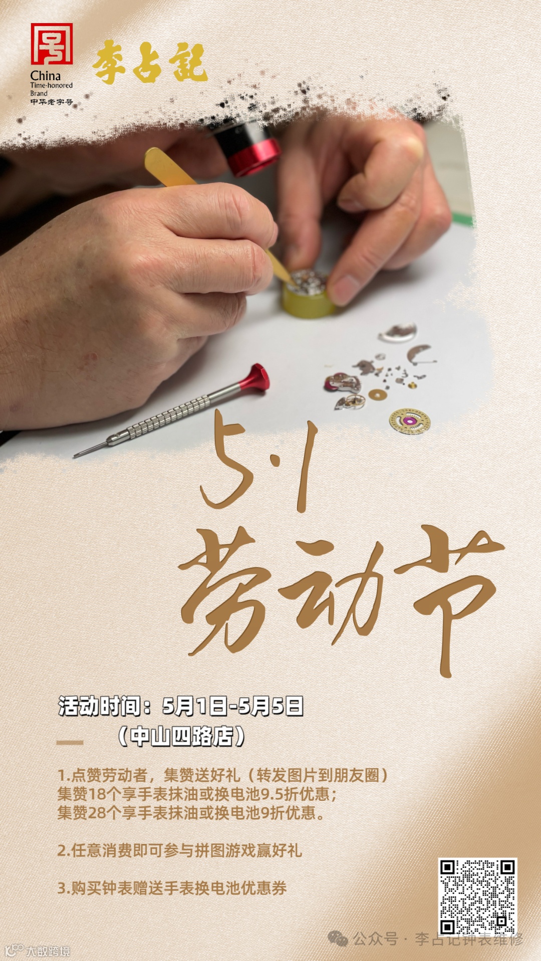 导读:1.点赞劳动者,集赞送好礼(转发图片到朋友圈)集赞18个享手表抹油或换电池9.5折优惠;集赞28个享手表抹油或