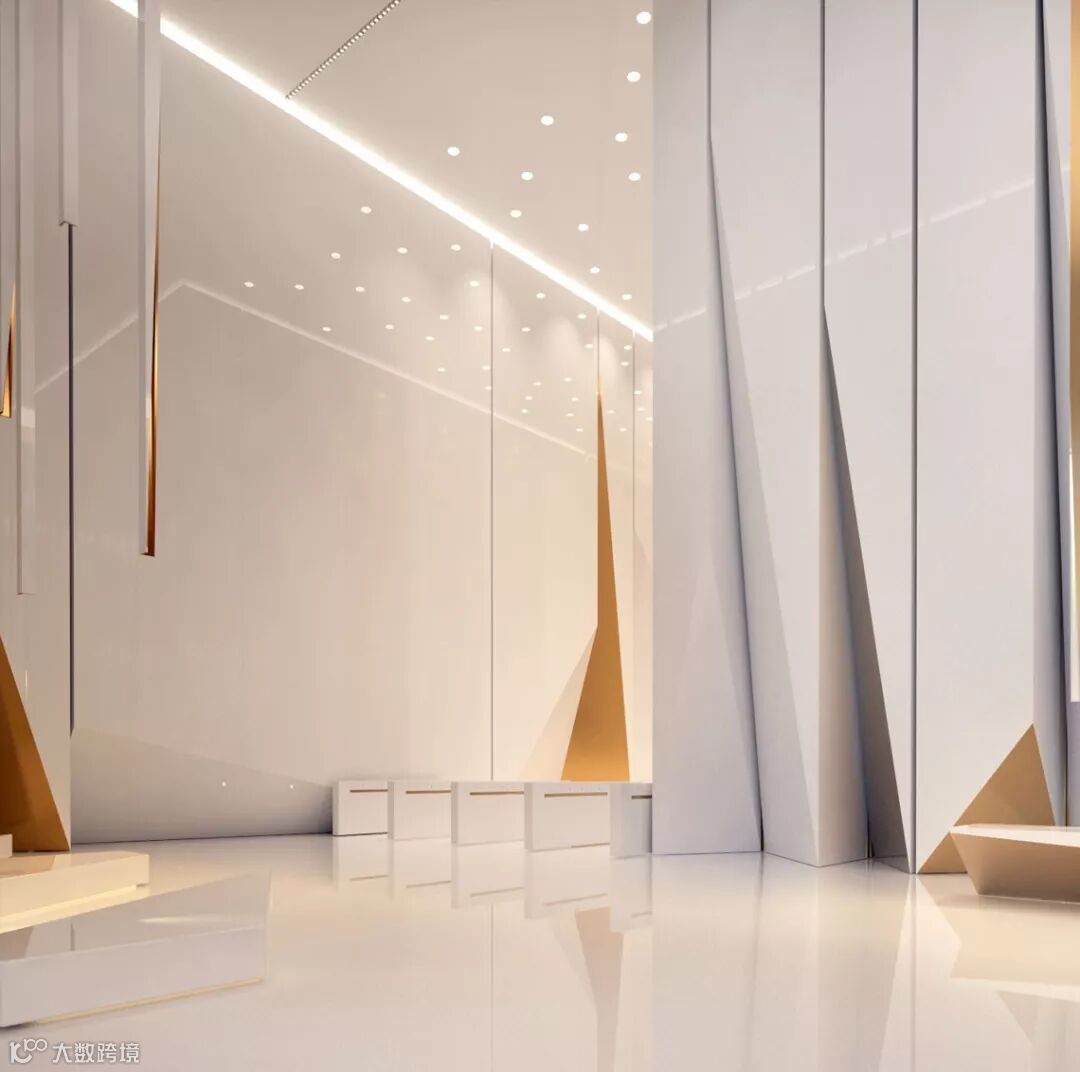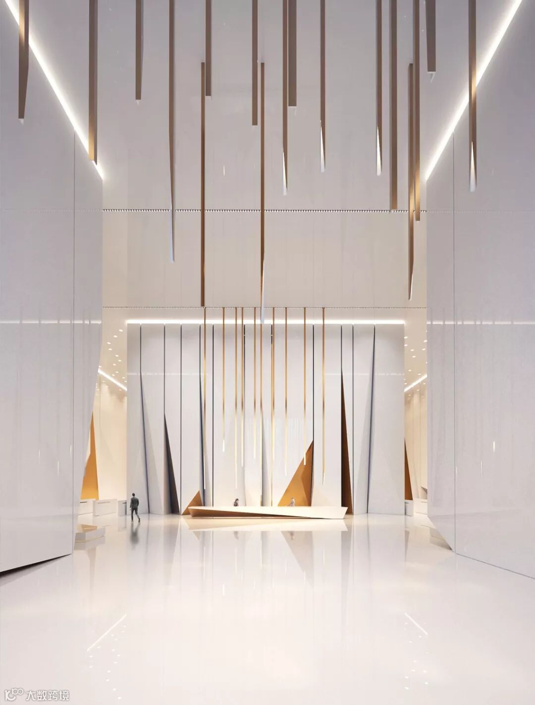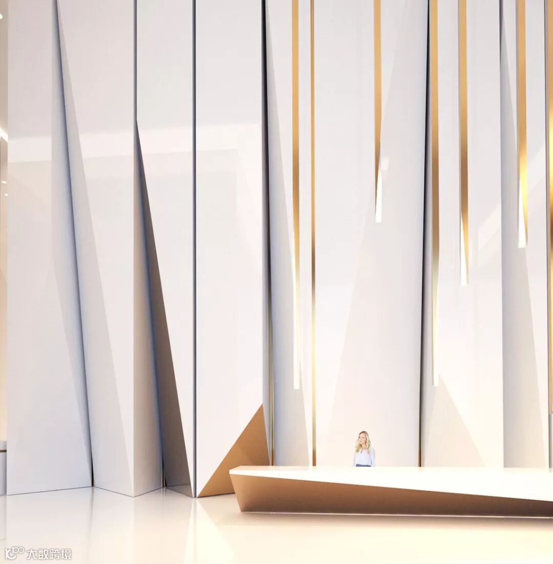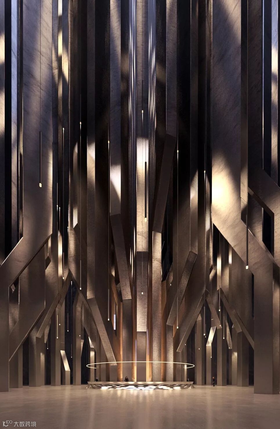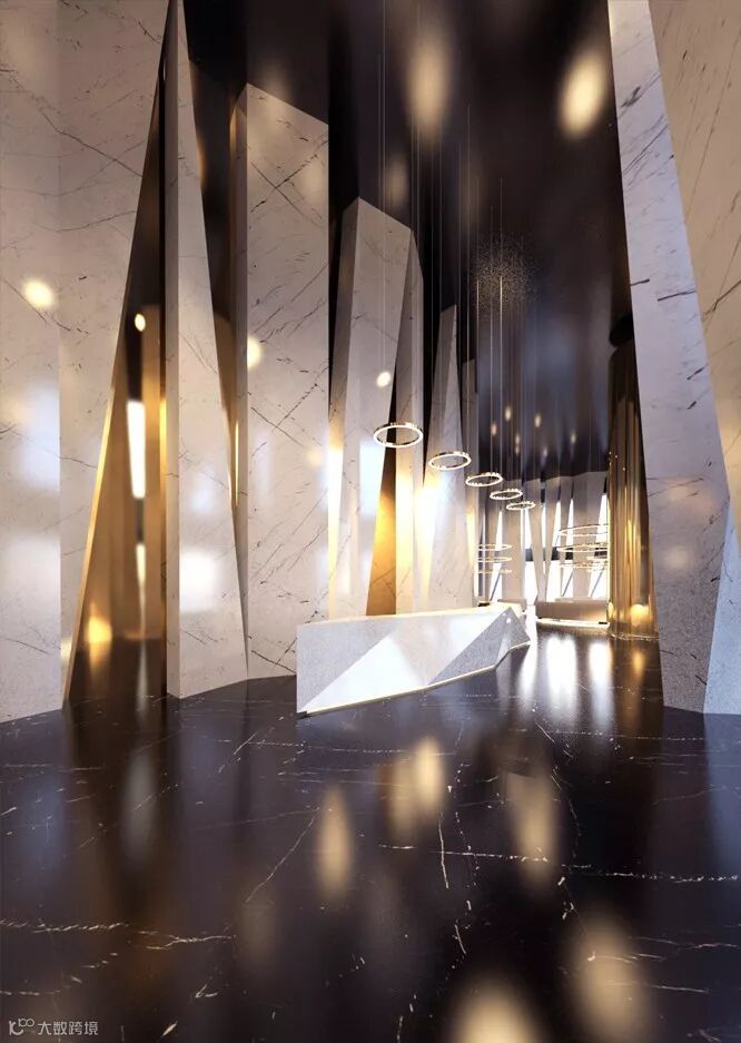 酒店大堂的几何形柱子、灯光、色彩,完美展现了简约空间的张力▽