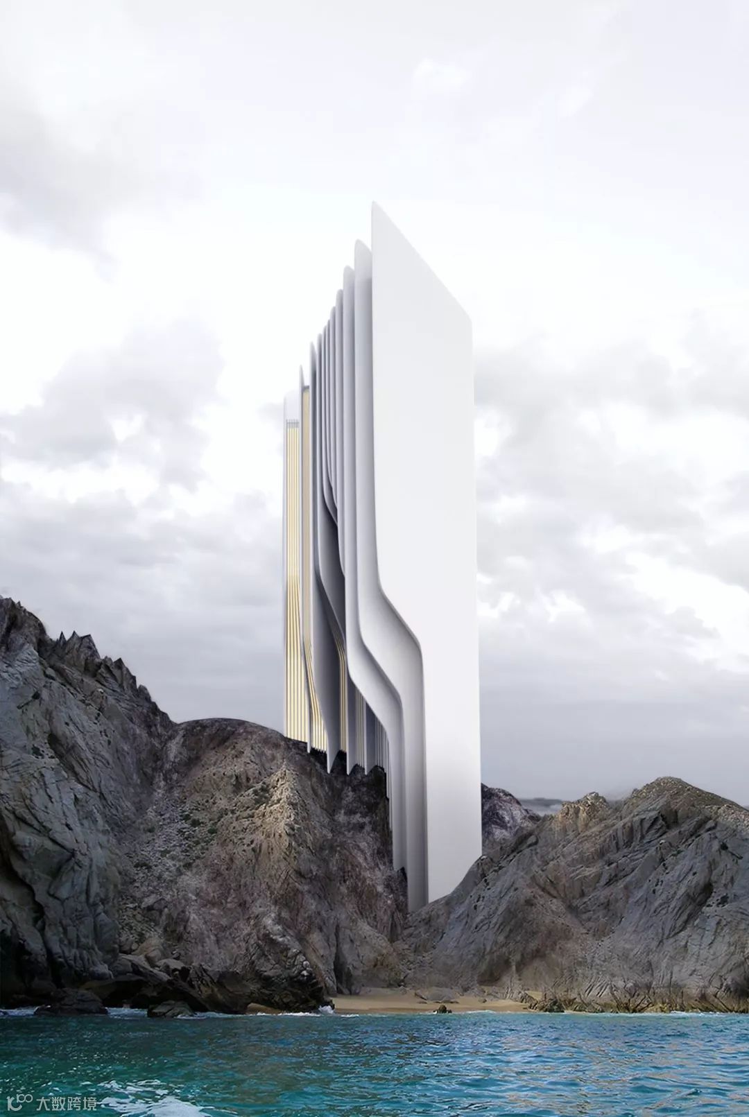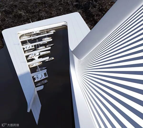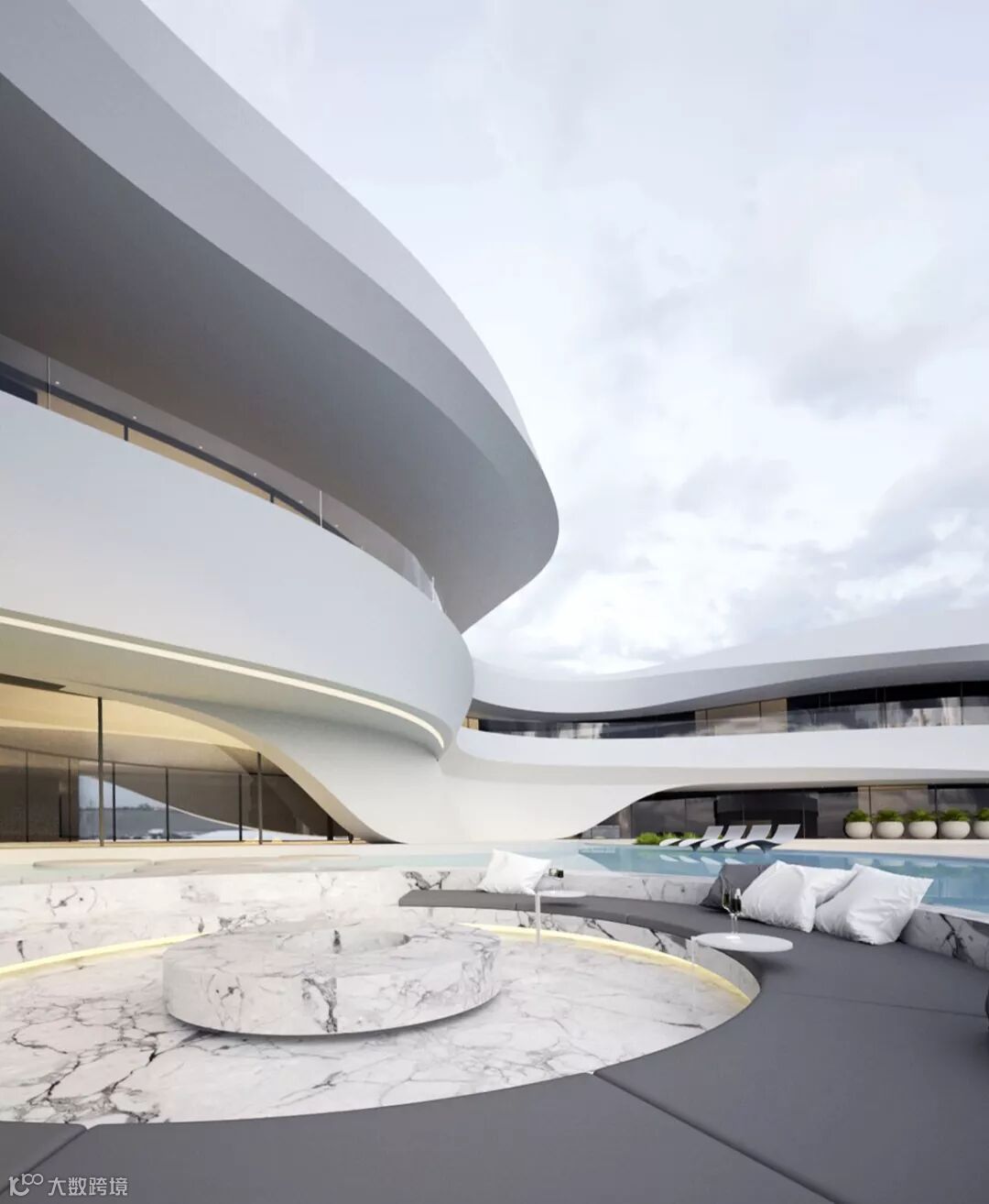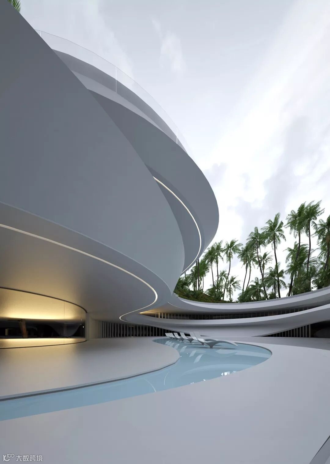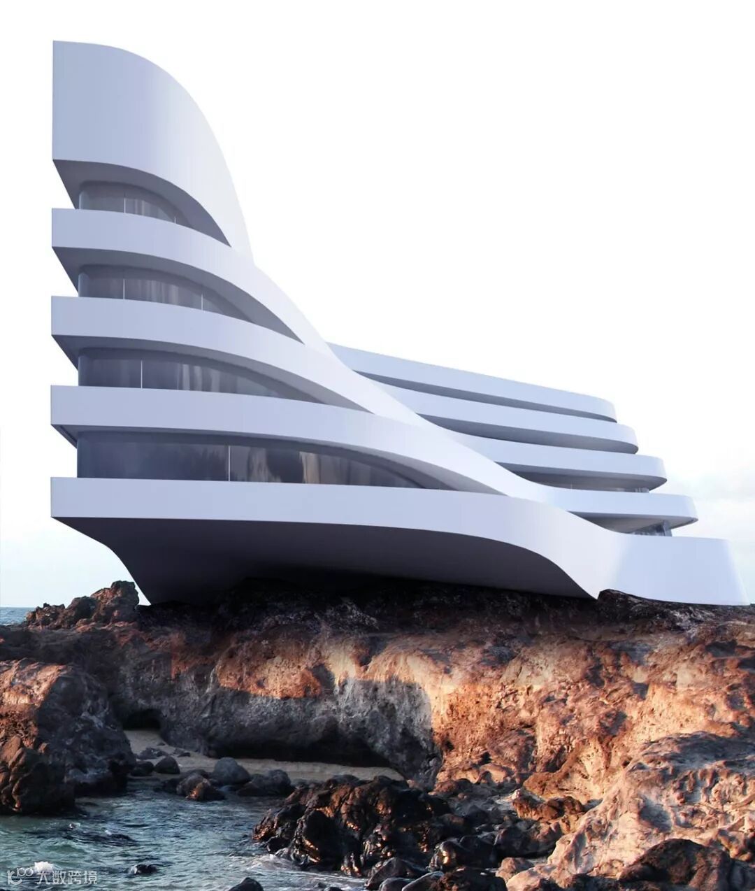 礁石旁悬挑的住宅,层层曲线犹如海水拍打在礁石上激起的浪花▽