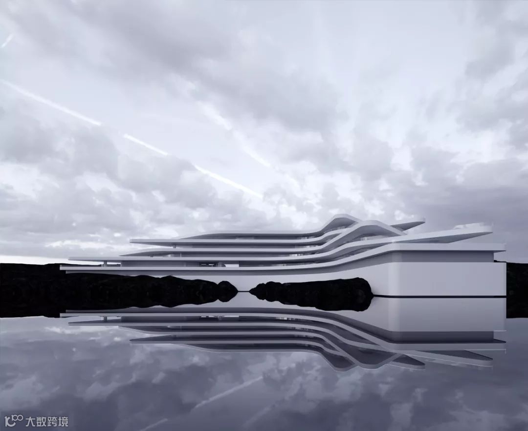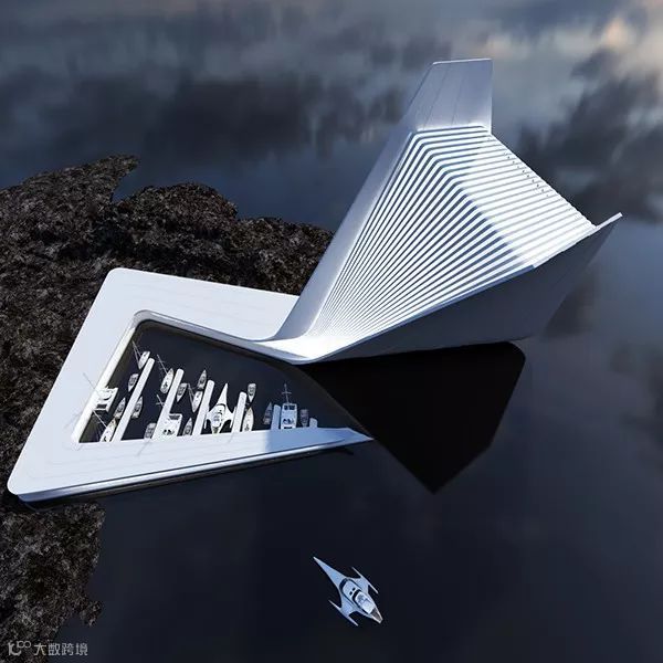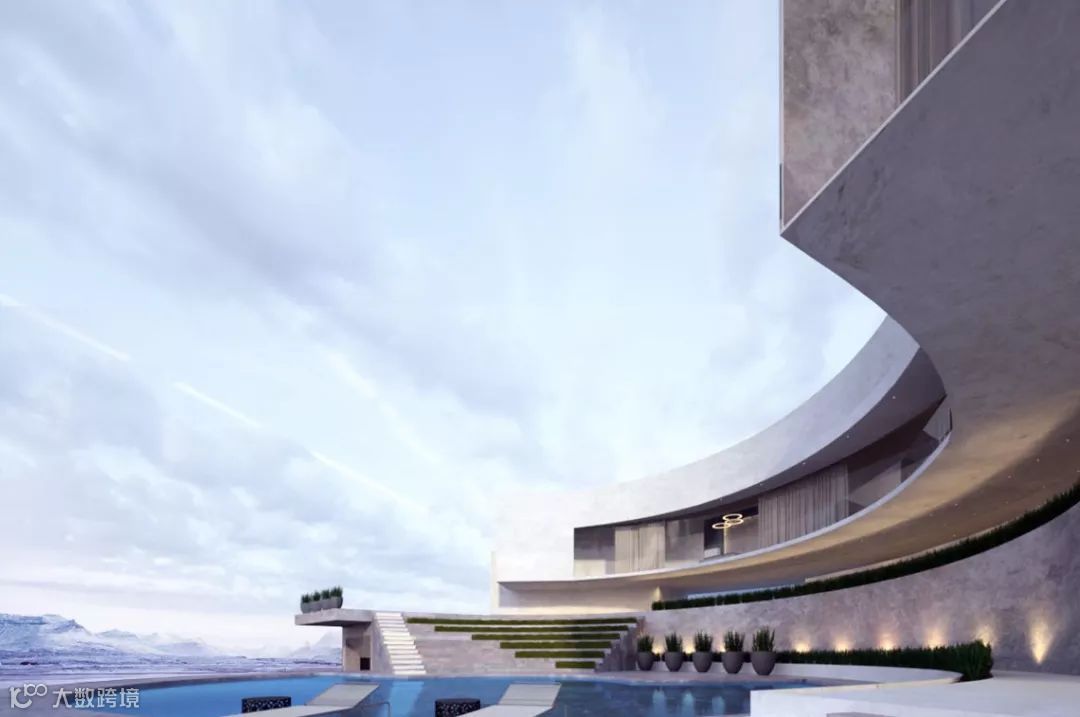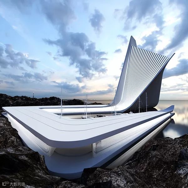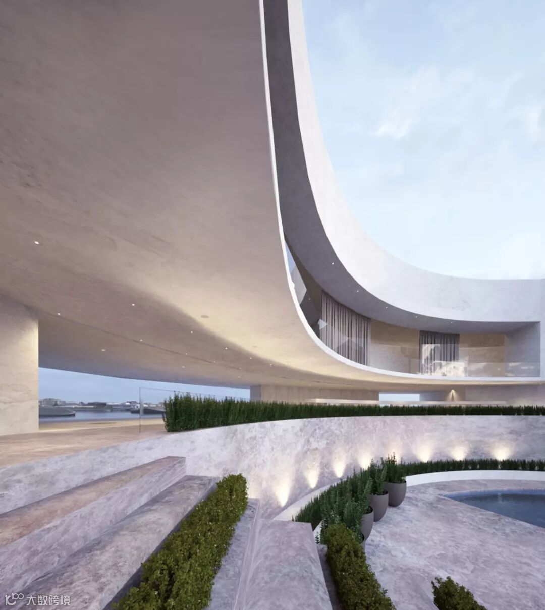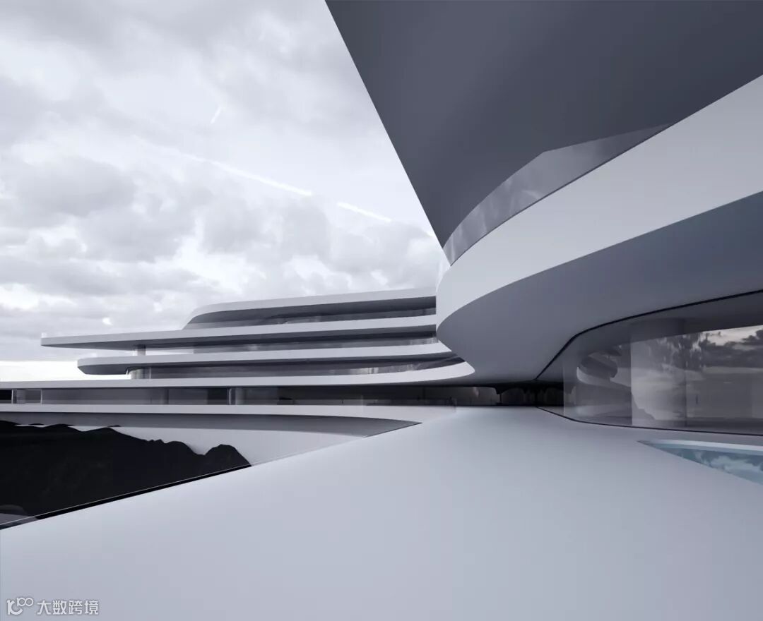 礁石旁悬挑的住宅,层层曲线犹如海水拍打在礁石上激起的浪花▽