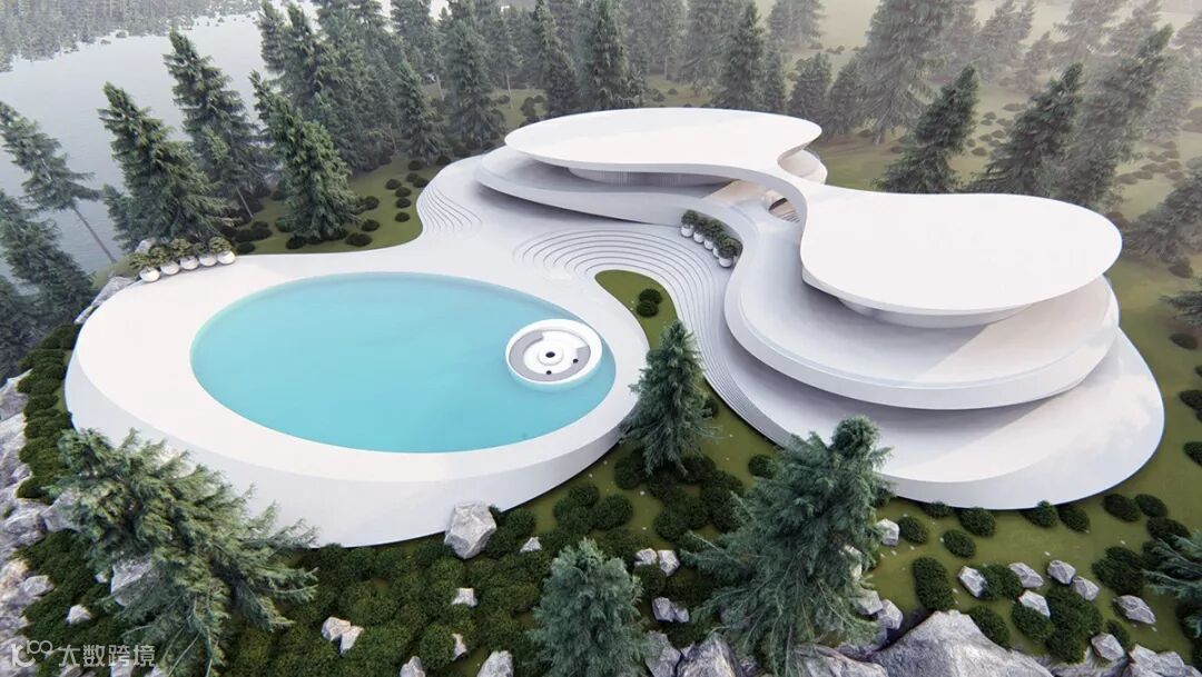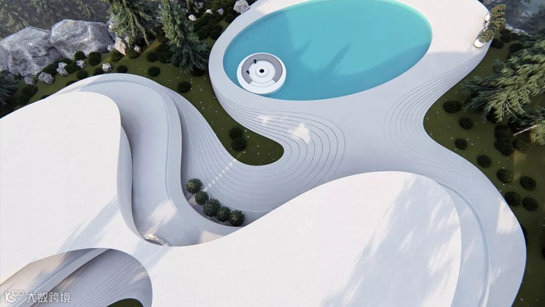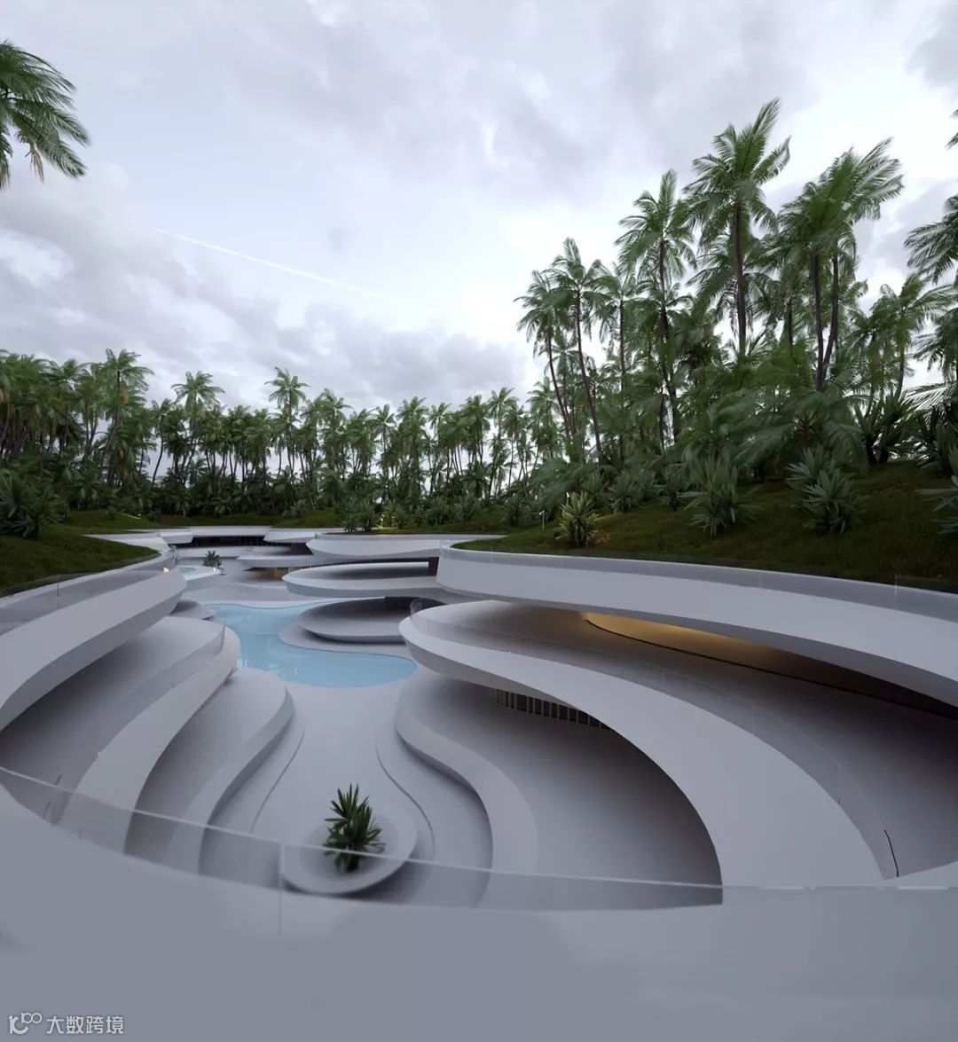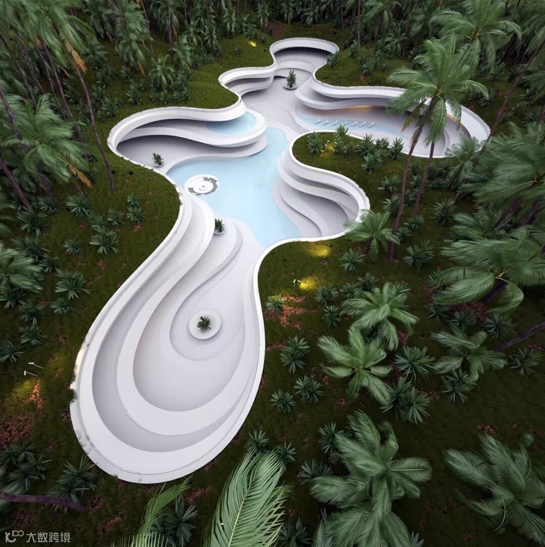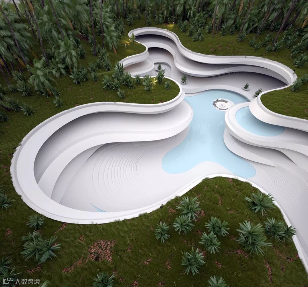 这个多层泳池综合体,形状像是一个大水洼,Roman Vlasov 将自然的活力与弯曲的人造结构结合在一起,揭示了多个层次的活动空间。