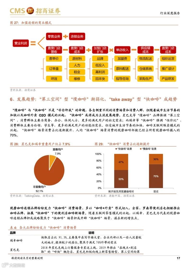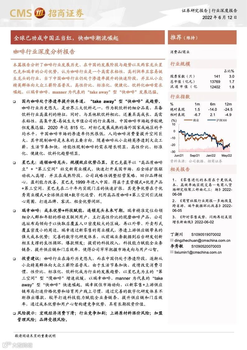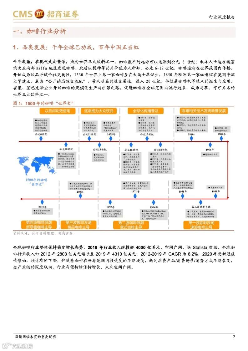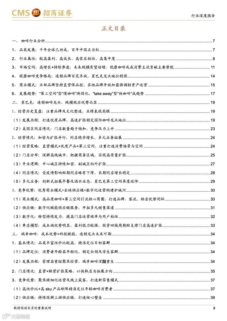 本篇报告分析了咖啡行业发展历史、在中国的发展阶段与趋势以及两家龙头星巴克和瑞幸的公司优势,认为咖啡行业是一个高需求粘性、高利润率且容易诞生龙头的行业,当下中国咖啡行业仍处于渗透率提升的快速阶段,并且从小众精英群体向大众工薪阶层普及,高性价比、标准化、便捷化、饮料化咖啡需求崛起,以瑞幸咖啡、manner 为代表的“take away”型“快咖啡”发展迅猛。