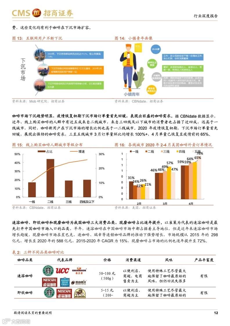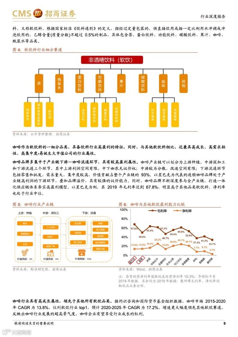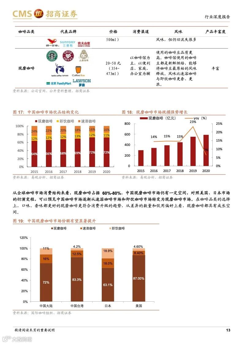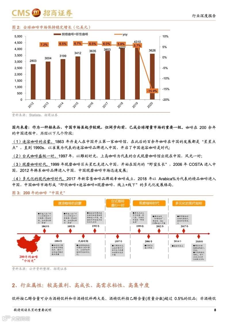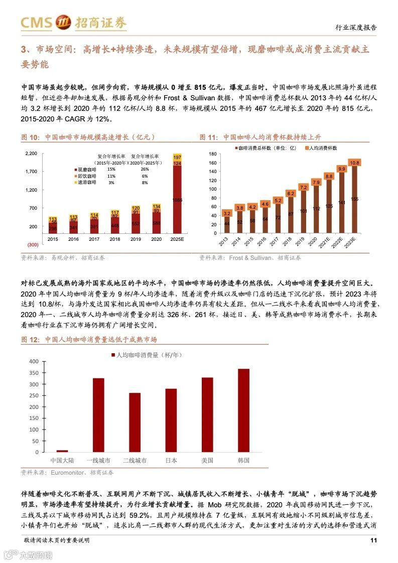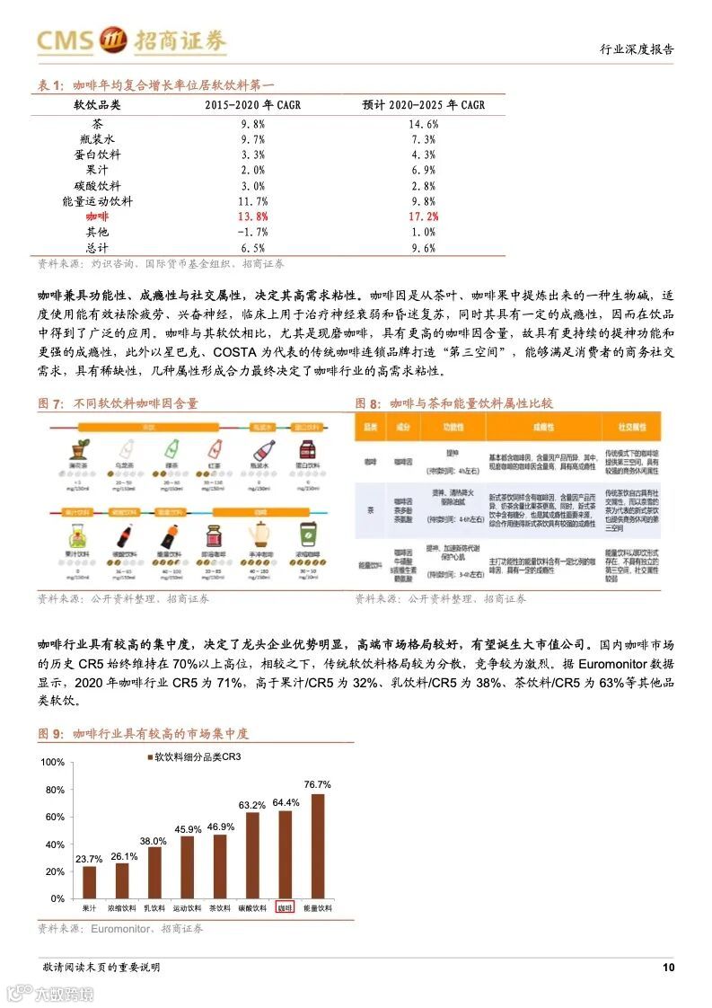 咖啡行业历史悠久,是世界三大饮料之一,作为软饮料的细分品类,具备饮料行业高盈利的特征,同时,与其他软饮料相比,还兼具高成长、高需求粘性、高集中度–易诞生大市值公司的行业属性。中国咖啡市场起步较晚但发展迅猛,2020 年达815 亿,对标已发展成熟的海外国家或地区的平均水平,中国咖啡市场的渗透率仍然很低,人均咖啡消费量提升空间巨大,其中现制咖啡是未来的主要方向。随着咖啡从小众精英渗透到大众工薪,生活节奏加快,功能性现制咖啡的需求增长明显,高性价比、标准化、便捷化、饮料化趋势明显。