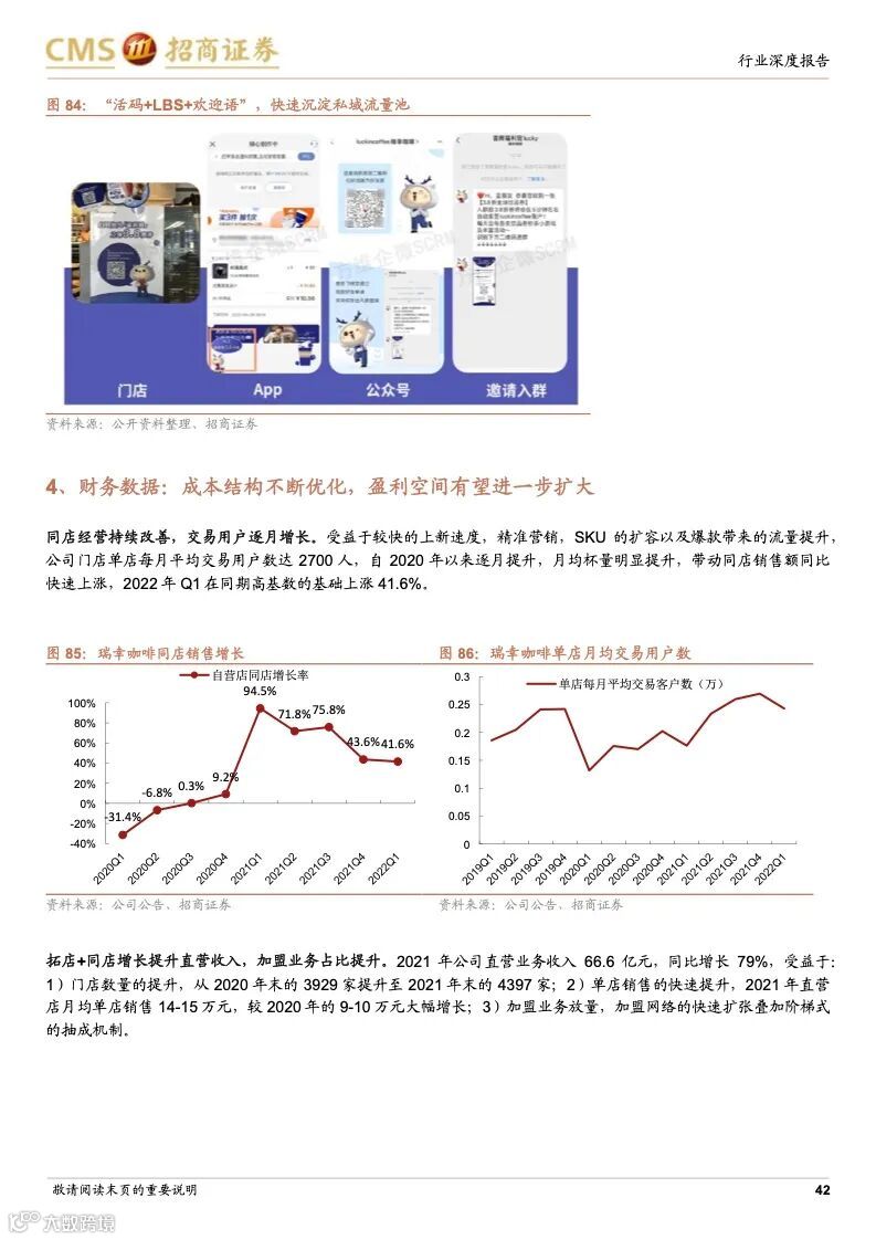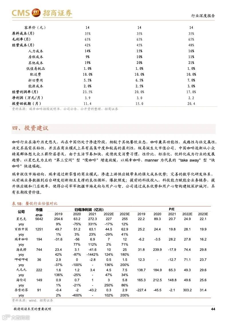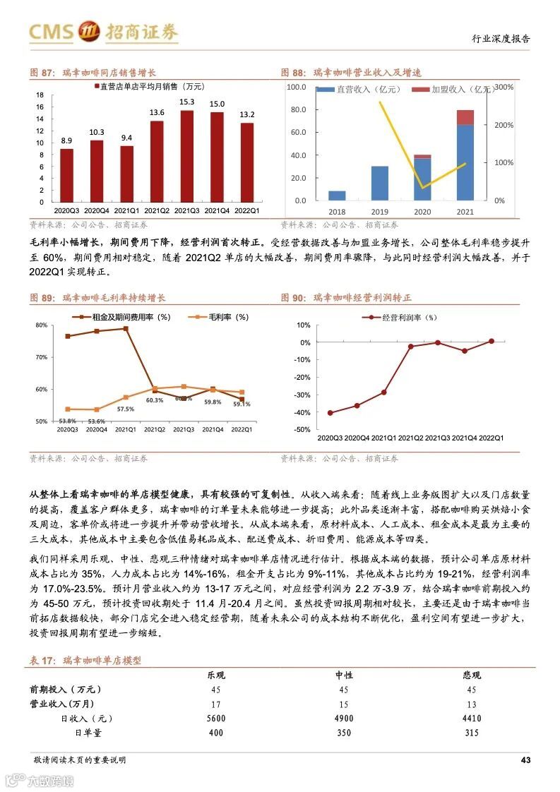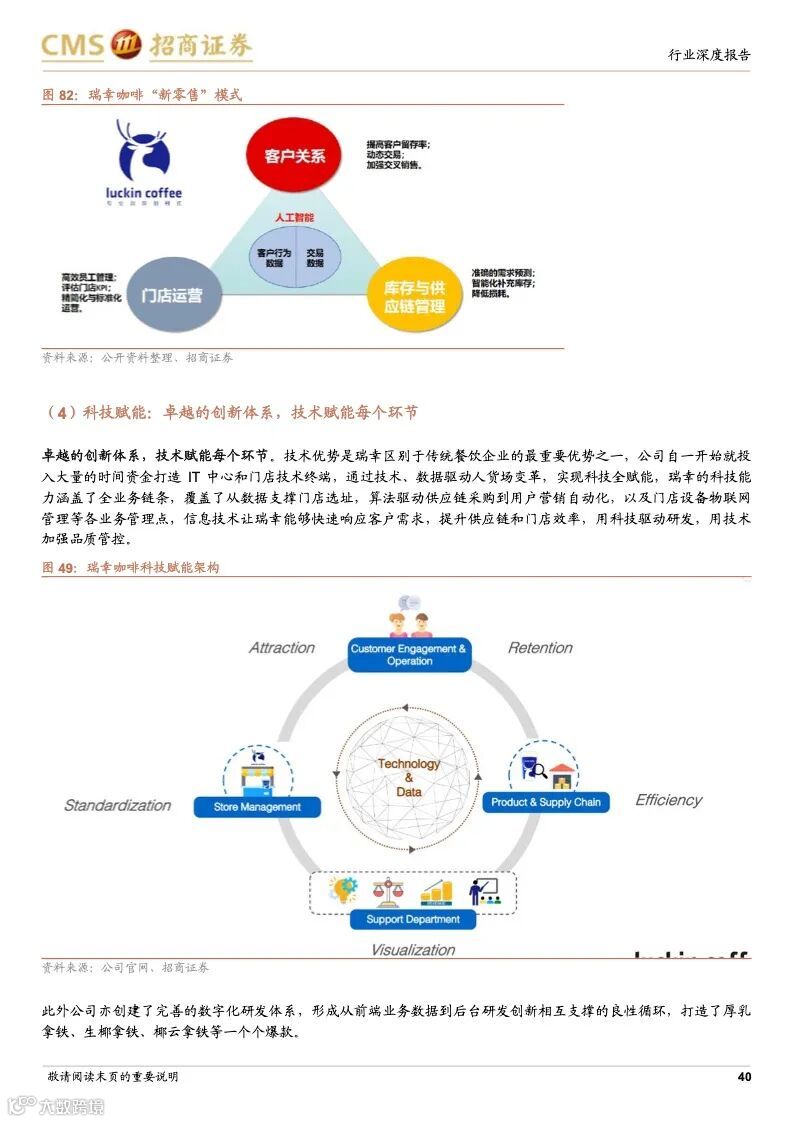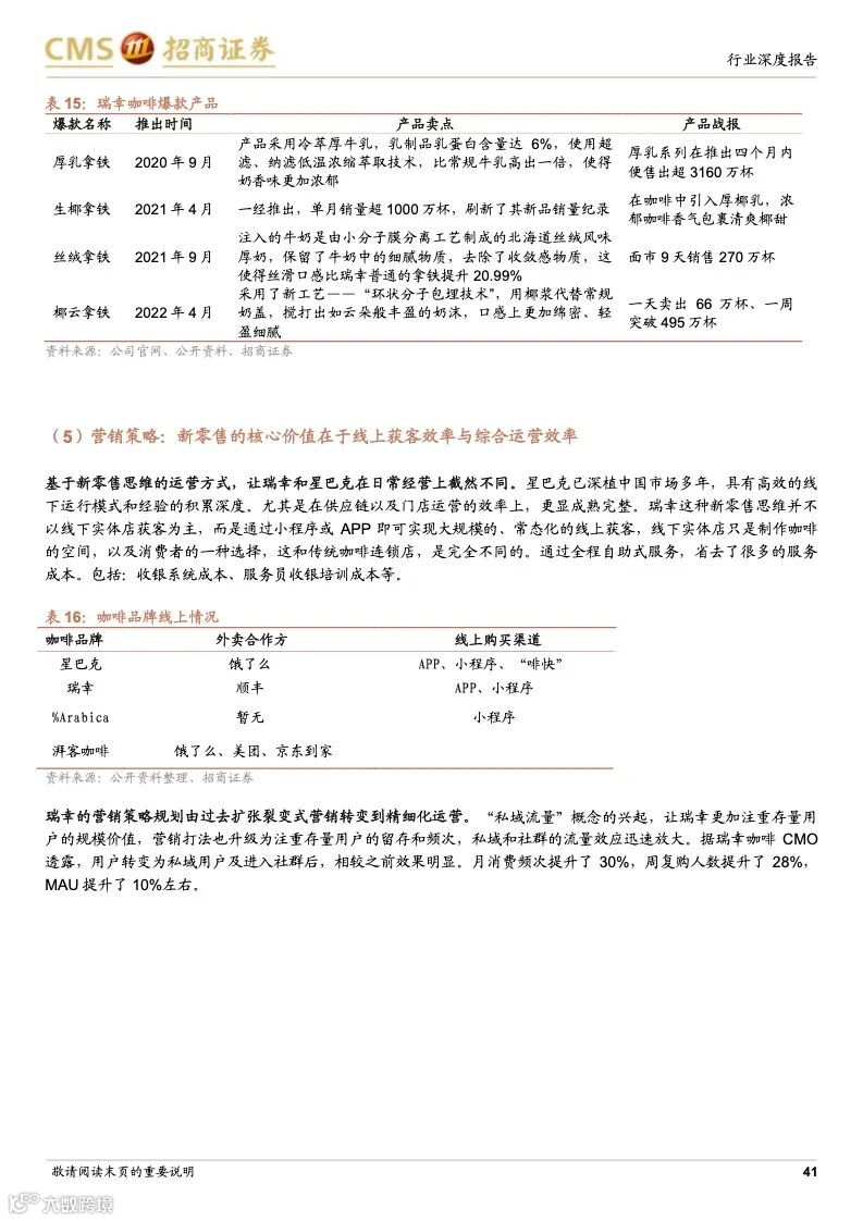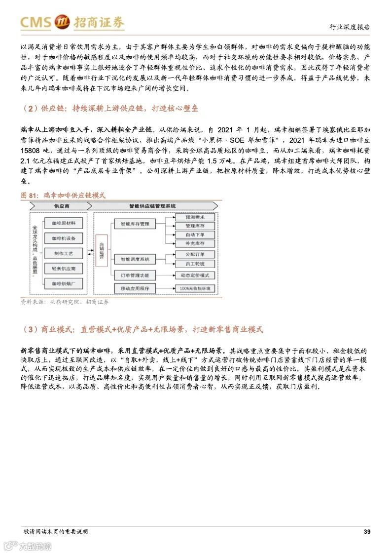 瑞幸咖啡:成本优势+科技赋能,连锁龙头未来可期。瑞幸精准定位白领细分人群和年轻的移动互联网用户,主打高性价比的现磨咖啡产品,公司选址布局倾向于以快取店覆盖人口密度较大的区域,再以外带、外卖形式覆盖密度小的周边。瑞幸通过新零售的商业模式,渗透上游供应链带来的强大成本优势;完善的数字化研发体系,从前端业务数据到后台研发创新相互支撑的良性循环,爆款频发;提前的科技投入,科技能力赋能全业务链条,提升供应链和门店效率,使得公司牢牢把握市场走向与用户心智。