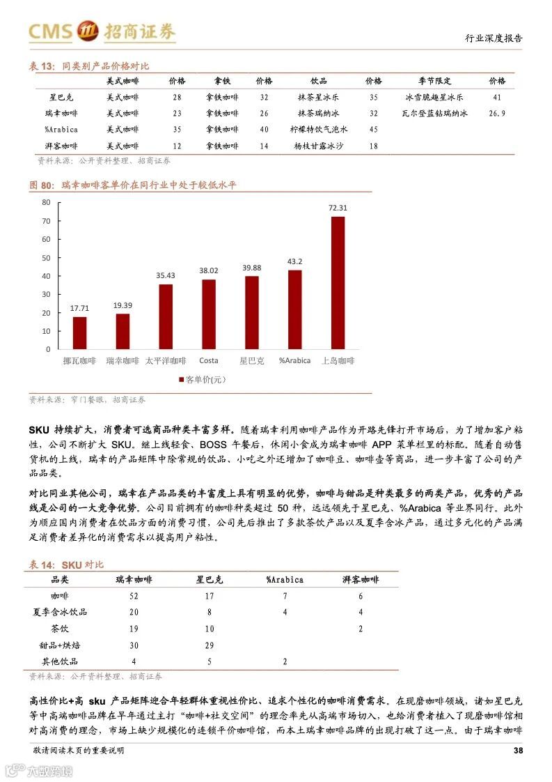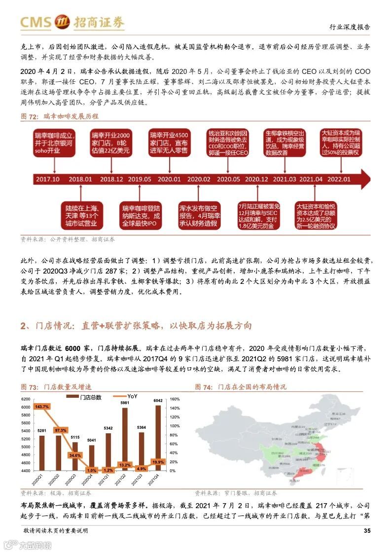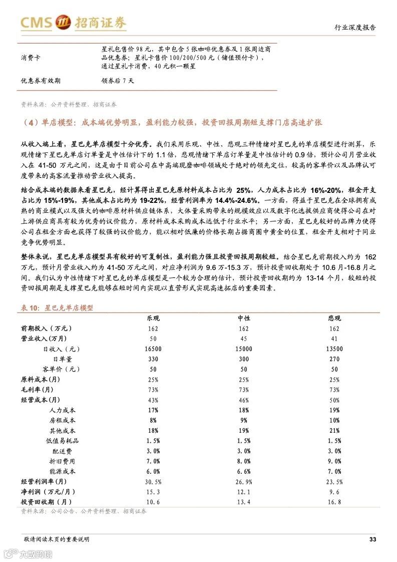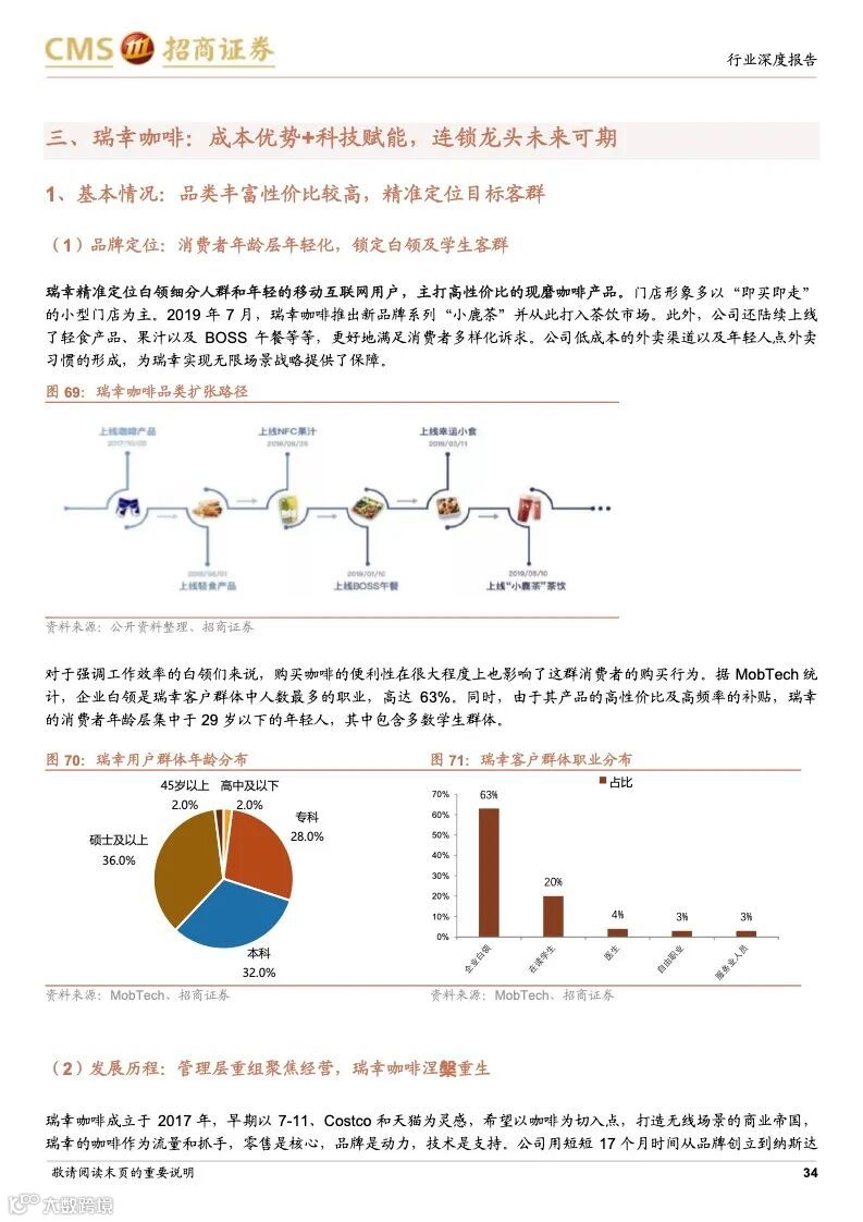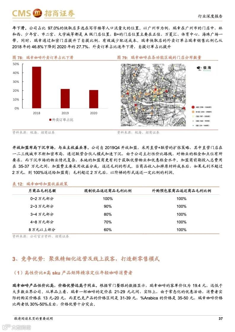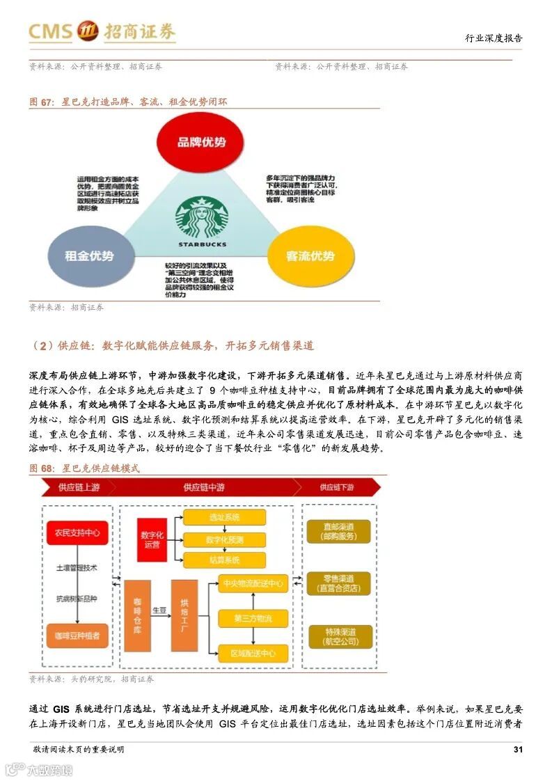 瑞幸咖啡:成本优势+科技赋能,连锁龙头未来可期。瑞幸精准定位白领细分人群和年轻的移动互联网用户,主打高性价比的现磨咖啡产品,公司选址布局倾向于以快取店覆盖人口密度较大的区域,再以外带、外卖形式覆盖密度小的周边。瑞幸通过新零售的商业模式,渗透上游供应链带来的强大成本优势;完善的数字化研发体系,从前端业务数据到后台研发创新相互支撑的良性循环,爆款频发;提前的科技投入,科技能力赋能全业务链条,提升供应链和门店效率,使得公司牢牢把握市场走向与用户心智。