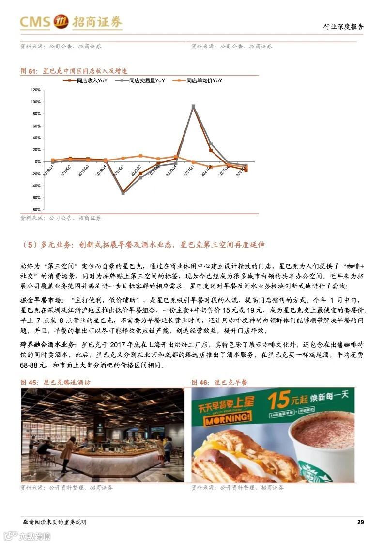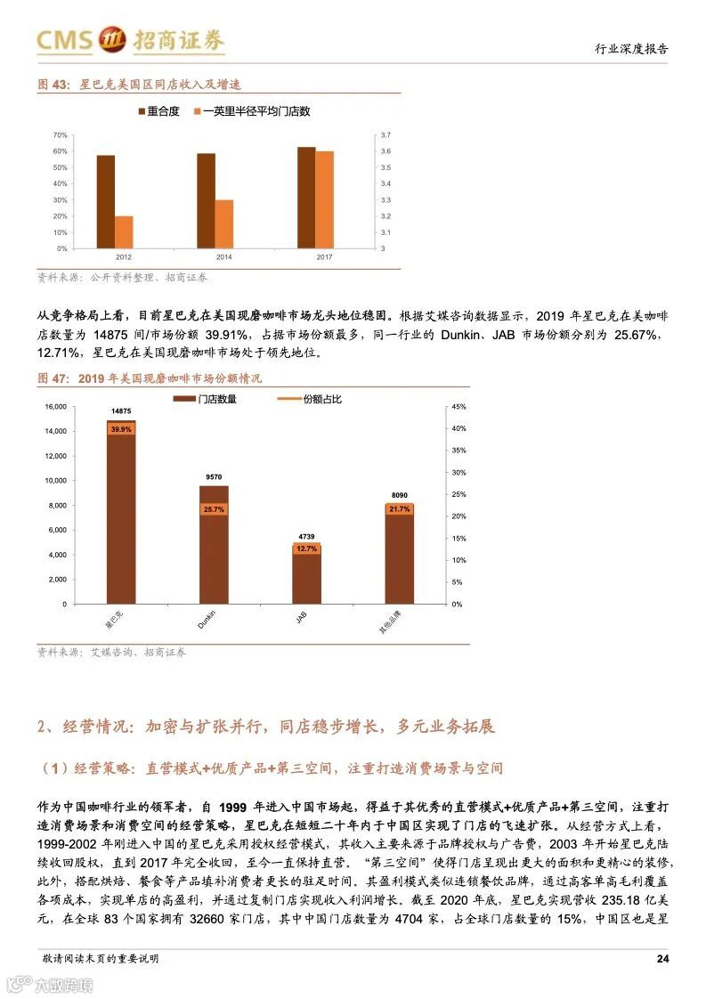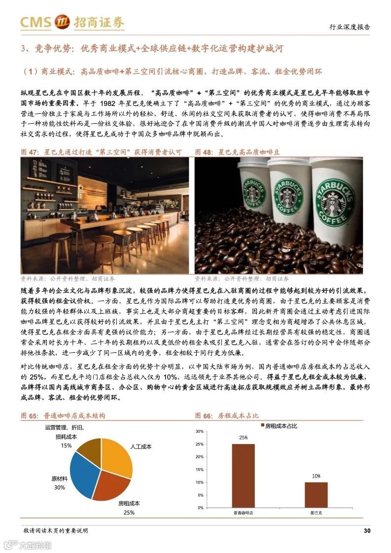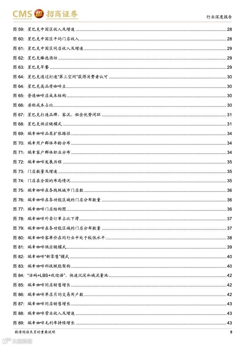 星巴克:连锁咖啡龙头,规模效应优势凸显。星巴克最早以“高品质咖啡豆”+“第三空间”社交新商业模式,快速打开美国市场,后全球扩张驱动收入高增,并且在成熟阶段,公司战略性调整经营策略,回归品牌核心,盈利能力改善。星巴克1999 年进入中国,得益于直营模式+优质产品+第三空间,星巴克在二十年内实现门店的快速扩张,其竞争优势在于优秀商业模式+全球供应链+数字化运营,利用高品质咖啡+第三空间引流核心商圈,打造品牌、客流、租金优势闭环。