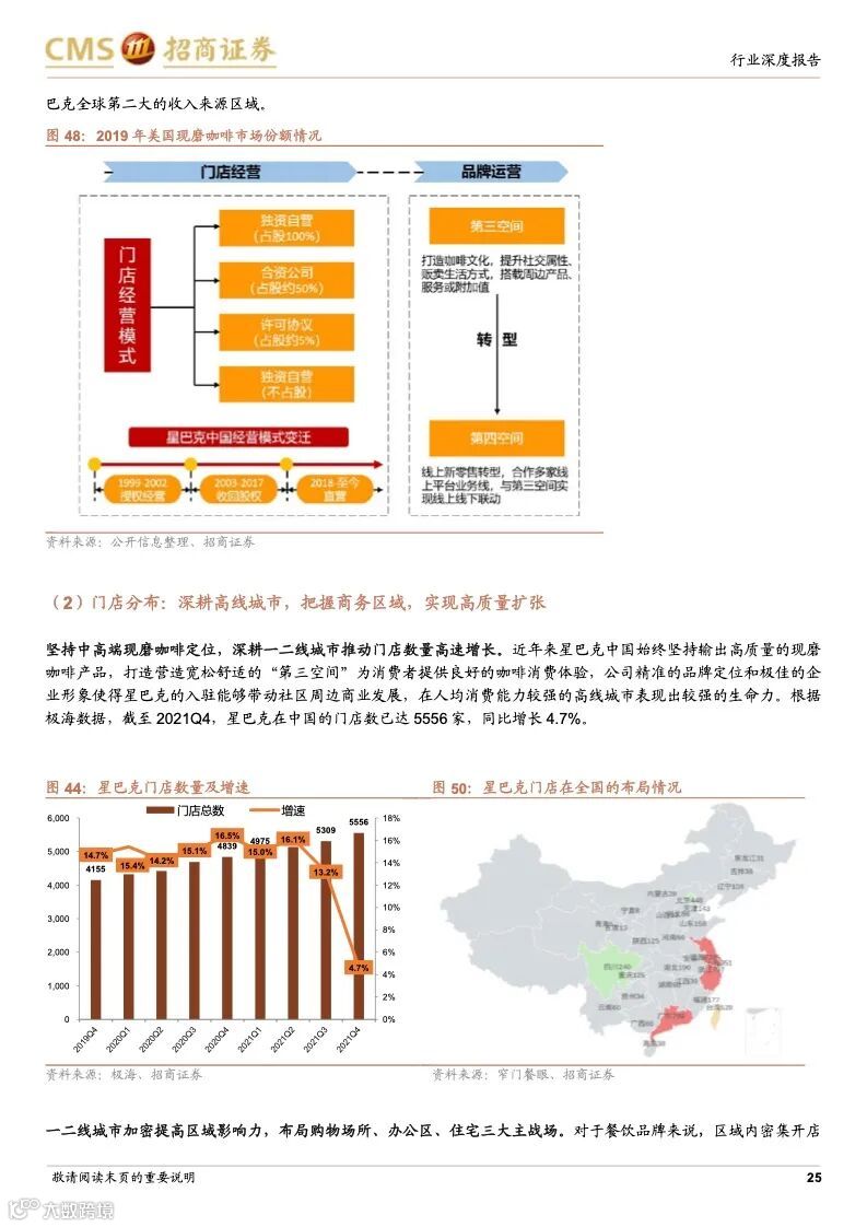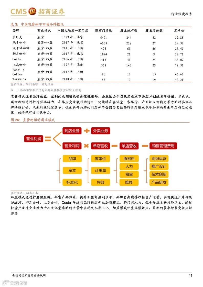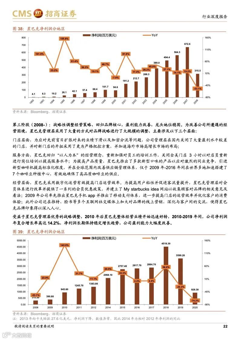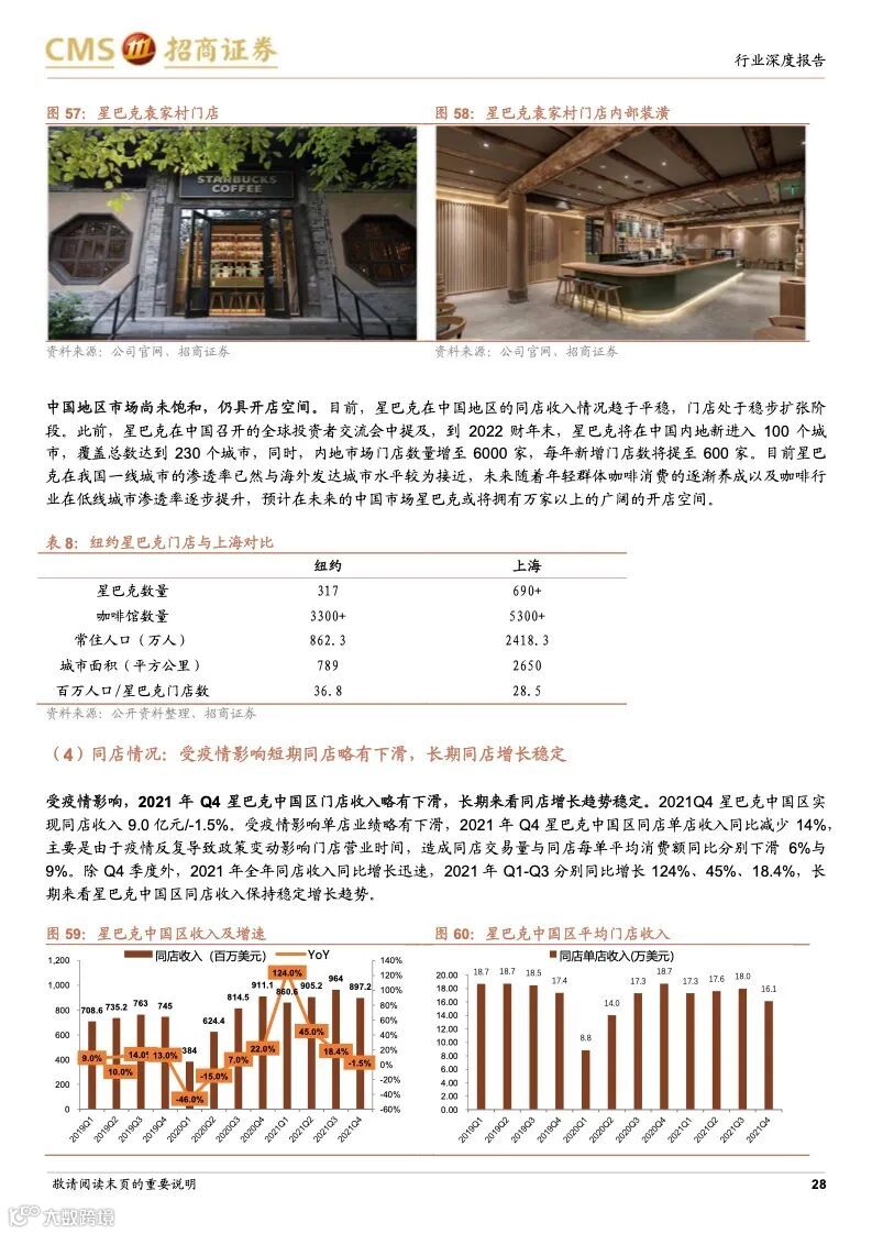 星巴克:连锁咖啡龙头,规模效应优势凸显。星巴克最早以“高品质咖啡豆”+“第三空间”社交新商业模式,快速打开美国市场,后全球扩张驱动收入高增,并且在成熟阶段,公司战略性调整经营策略,回归品牌核心,盈利能力改善。星巴克1999 年进入中国,得益于直营模式+优质产品+第三空间,星巴克在二十年内实现门店的快速扩张,其竞争优势在于优秀商业模式+全球供应链+数字化运营,利用高品质咖啡+第三空间引流核心商圈,打造品牌、客流、租金优势闭环。