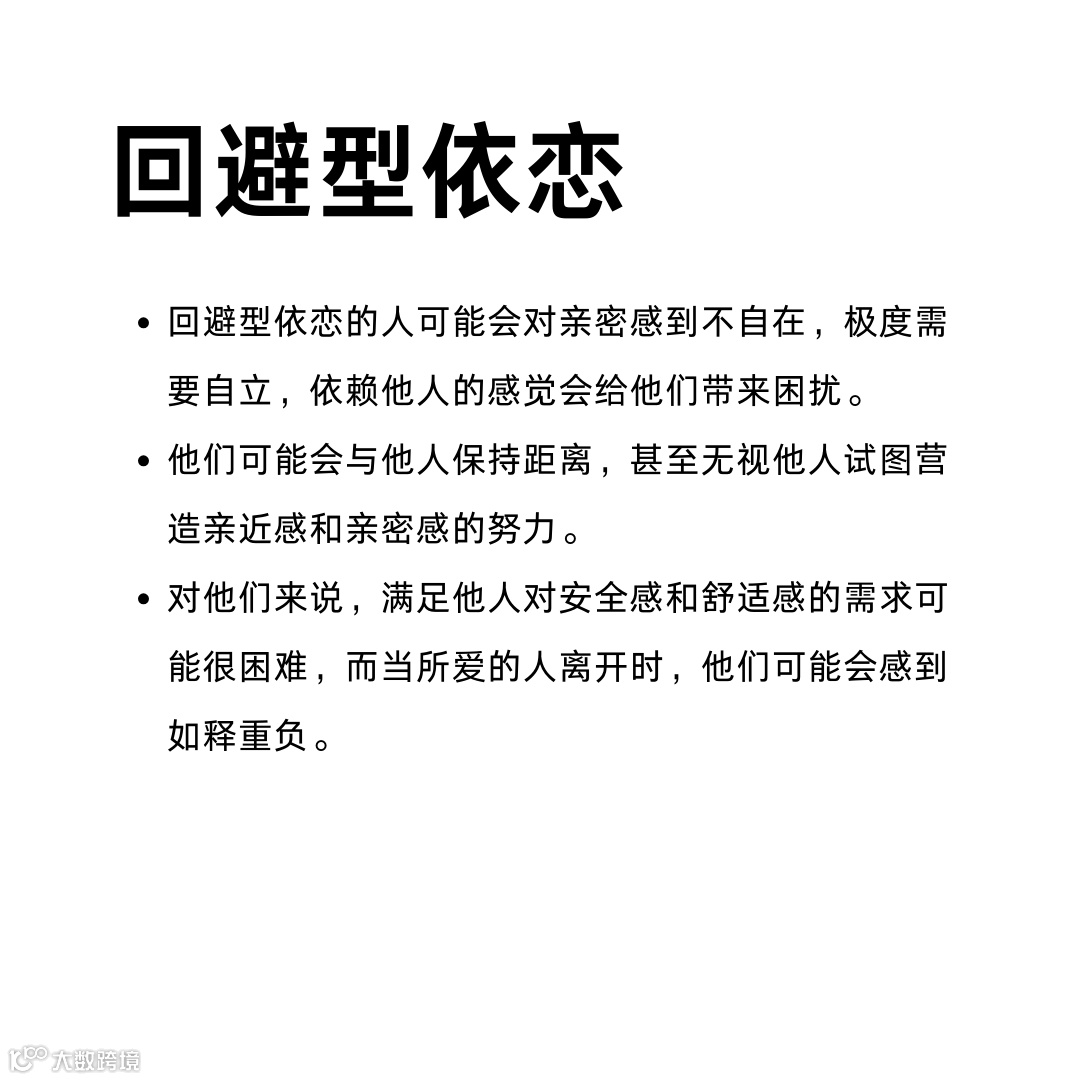 不健康的依恋可能表现为过度自立,害怕恐惧依赖他人或被他人依赖,与人保持距离,一旦有人靠近就会逃走,也可能表现为非常缺乏安全感,苛求甚至粘人,一旦爱人不在身边就会胡思乱想,甚至对伴侣的离开感到极度的愤怒和失望,很难再信任对方。