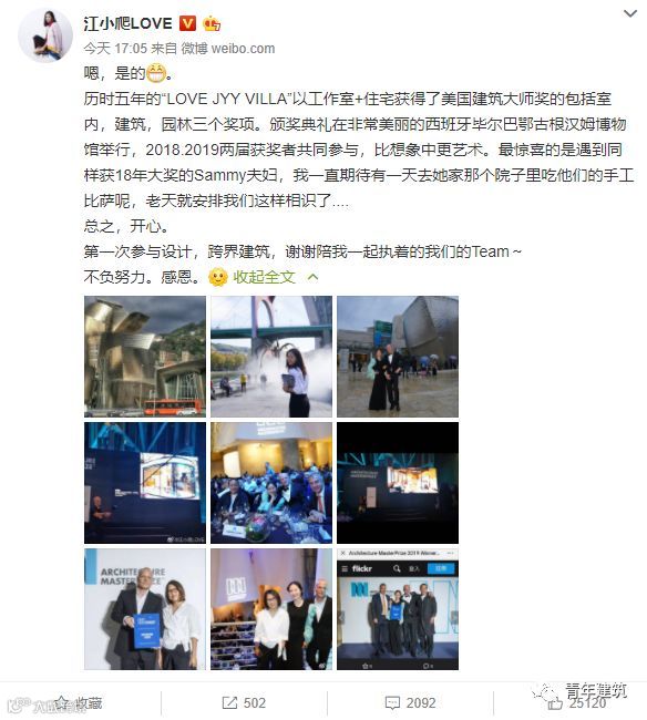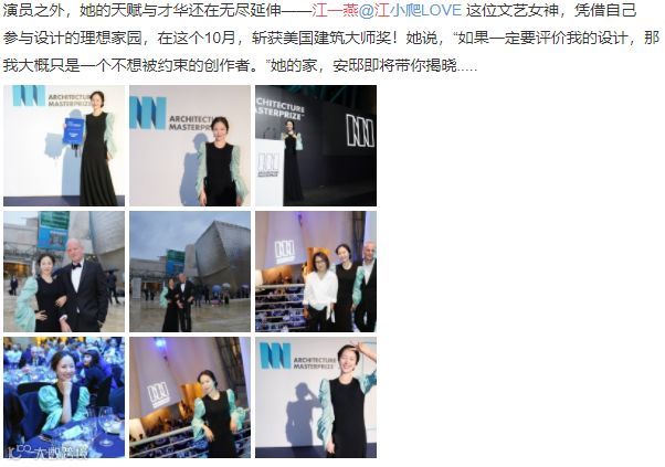 江一燕在微博中称项目获得了包括室内、建筑、园林的三个奖项。并自称是一次跨界。