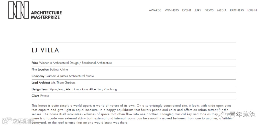 在Architecture MasterPrize官网上搜索“LJ Villa”就能搜索到江一燕的项目介绍: