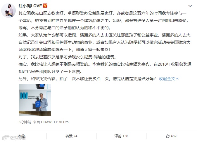 22日晚,江一燕发出最新微博,文中提到了个别人的质疑与不平衡,同时提及自己参与的公益事业,希望以此回应网友的“造假”质疑。但她显然没有意识到,来自建筑设计界的质疑本质上是对于设计师职业尊严挑战的一种自卫。