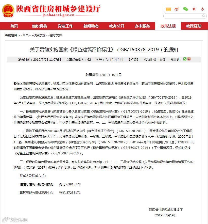 一、各级住房城乡建设行政主管部门要认真贯彻实施《绿色建筑评价标准》(GB/T50378-2019),加强管理,规范和引导绿色建筑的健康发展。《陕西省民用建筑节能条例》规定执行绿色建筑标准的四类建筑工程项目,应达到新版标准基本级以上。对取得设计文件绿色建筑专项审查合格意见的,可认定为基本级绿色建筑。一、二、三星级绿色建筑应委托评价机构进行预评价。