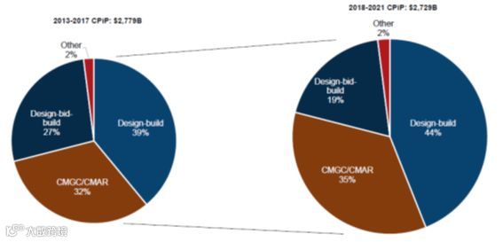 在美国工程建设市场上,主要存在三种工程建设模式:DBB 模式(DESIGN-BID-BUILD,类似于我国传统工程建设模式)、CMGC/AR 模式(承包商介入工程设计阶段,类似于分阶段工程总承包模式)、DB 模式(DESIGN-BUILD,由一个承包商负责全部设计和施工,类似于全过程工程总承包模式)。根据美国设计建造学会和 FMI 咨询公司的研究,2013 年到 2017 年期间,美国工程建设市场上 DB 模式占比最高,达 39%;2018 年到 2021 年的预测表明,DB 模式占比将进一步扩大,达到 44%。因此,在美国工程建设市场上,全过程工程总承包模式由于具备工期短、变更少、业主可控性高等优势,成为最重要的工程建设模式。