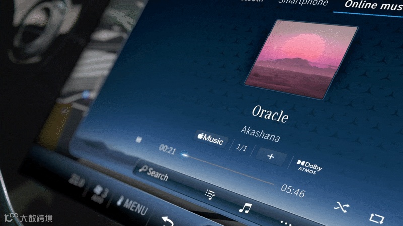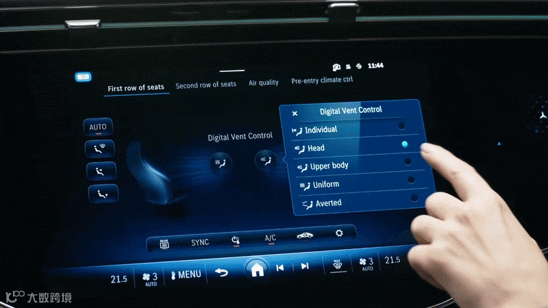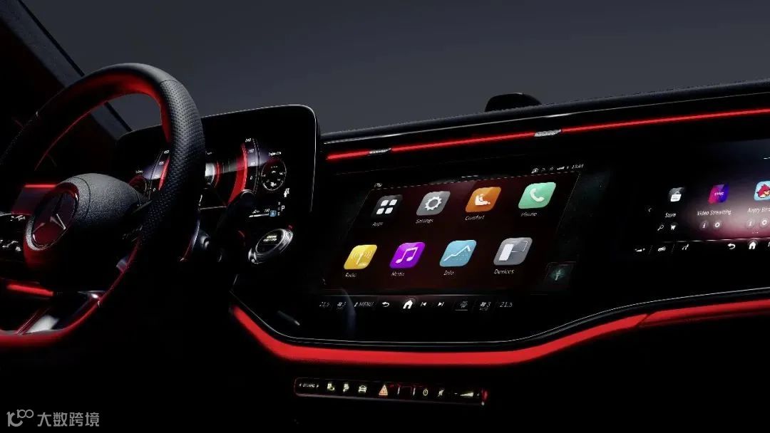 全新MBUX超级屏(MBUX Superscreen)以一整块玻璃面板覆盖中控屏与乘客显示屏,简洁的应用图标与智能手机的观感接近,更符合当下用户的使用习惯。贯穿式空调出风口悬浮于屏幕上方,浑然天成。独立的数字仪表屏让驾驶者可以更专注驾驶,并提供“经典”和“运动”两种显示风格。主动式环境氛围灯贯穿仪表台经车门向后自然延伸,以流畅的整体设计营造出环抱式的感官沉浸氛围。