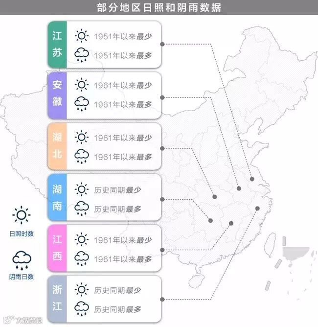 其中,除江苏、福建单日平均日照时数分别为2.5小时和2.6小时外,上述其余省份都不足2小时,湖南不足1小时。