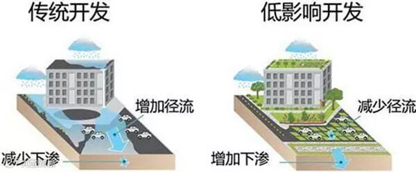由传统开发到低影响开发,低影响开发主要是通过对雨水的渗透、储存、调节、传输、截污净化等功能有效地控制径流总量、径流峰值和径流污染。▼