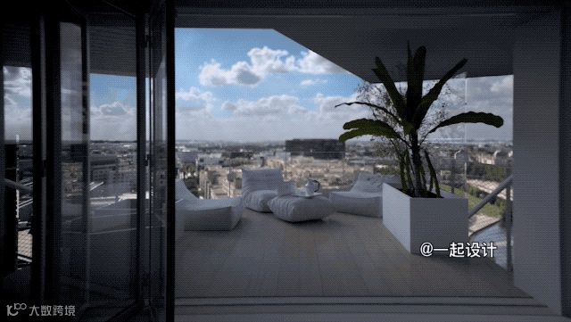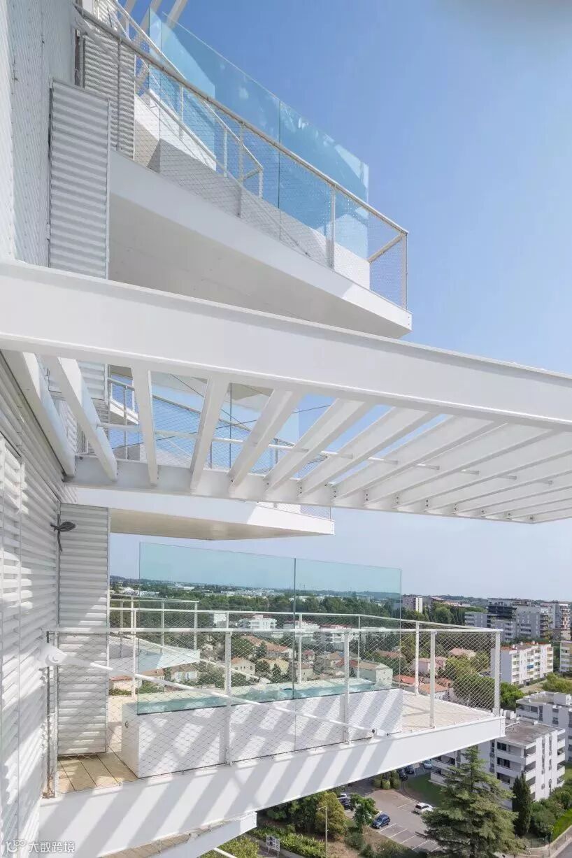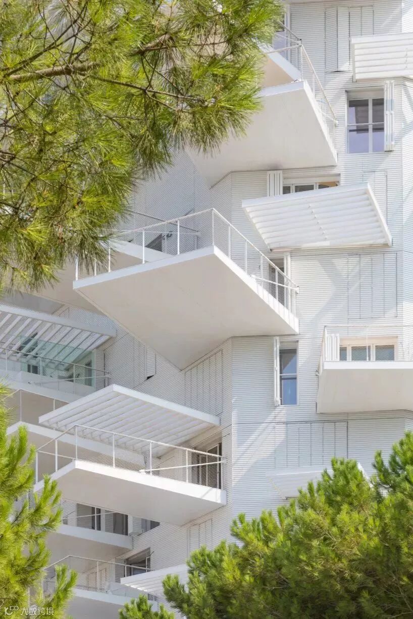 建筑围绕中心挑出的大阳台和遮阳篷▽