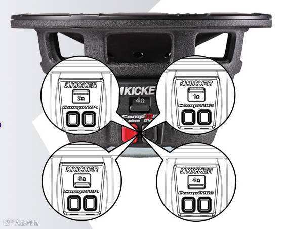 +CompR低音喇叭通过一对结实的按键式端子,可以灵活地跳跃到了另一个层次,提供了一个方便且容易改变双音圈输出阻抗的阻抗选择器滑块(2/8欧姆或1/4欧姆,依型号而定)。在串联或并联配置中转换也不用多余的接线。