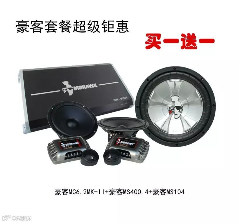 广州音皇推出的豪客MC6.2MKII套装喇叭+MS104超低音+MS400.4功放套餐,轻松给车主解决原车音响不足的烦恼!本系统属于非常大众化的一套配置,适合听流行音乐,轻音乐,慢摇等类型的音乐,也可以偶尔听听嗨歌!,套装高音采用钛金属音模,金属味十足,6.5寸中低音音对于中低频的表现非常到位。搭配一只原装进口10寸超低音,对于喜欢DJ,摇滚,R&B歌曲的朋友也是非常适合的一套系统!